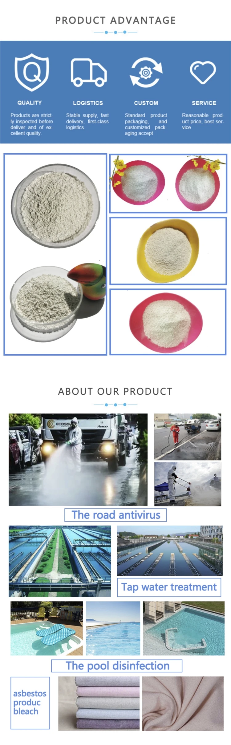 Calcium hypochlorite can be widely used as algicide, bactericide disinfectant, bleaching agent or oxidant because of the available chlorine in the product.