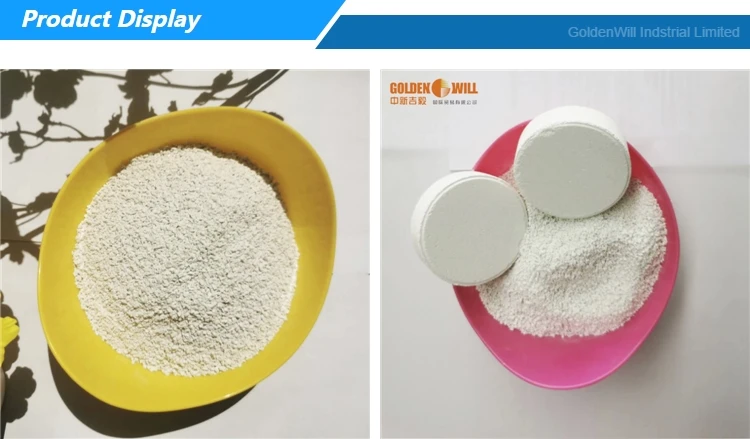 For example, it has a wonderful disinfections for swimming pool, drinking water, cooling tower, ore-dressing and waste water, food, farming, fishery, hospital, school, station and household etc. good bleaching and oxidation are also found in paper and dye industrial.