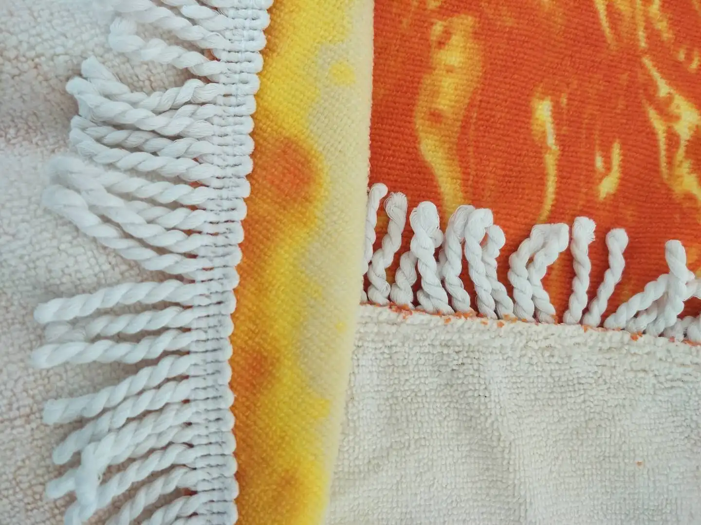 Microfiber round beach towel --- 100%polyester material, quick-dry, soft and light. one side is customised print design, cound be digital\\sublimation\\desperse printing depend on buyer's quantity and artwork,and back is white small terry. the edge is attached white polyester/cotton taassels as buyer's requirement.