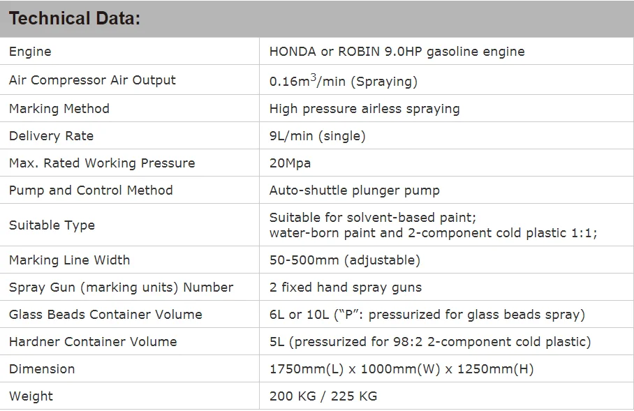 TATU hand-pushed and hand-guided (self-propelled) cold paint road marking machine is a kind of airless high pressure sprayable marking machine which is widely used throughout the world. They have the advantages of low investment, light weight, easy loading, easy operation and maintenance, suitable for the marking work with thermoplastic paints in all kinds of roads, vehicle parks, schools, factories, etc.