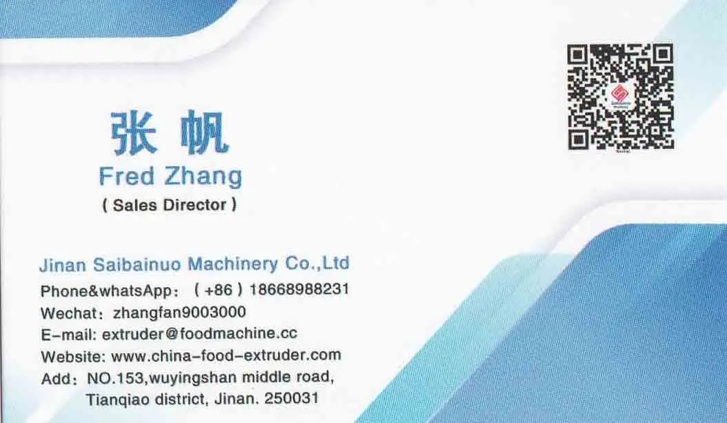 Since 1994, JINAN SAIBAINUO MACHINERY CO., LTD is always the professional manufacturer and the model company for advanced and high efficient extrusion food machinery in this field. Saibainuo Company congregates an expert team with ten-year experiences in this extrusion machine industry,not only working hard to constantly researching extrusion technology, but also exploring food processes in order to benefit our clients producing creative food. After years of exploration and research, our screw extrusion technique has been widely applied to produce the following products: extrusion leisure snacks machine, breakfast cereals food and corn flakes machine, fried snacks food machine, pellet food machine, bread crumbs machine, texture soy protein machine, pet food machine, pasta & macaroni machine and vegetarian meat machine, etc.More than twenty production lines with different functions and capacities can be chosen. And we can also provide customized service for special requirements