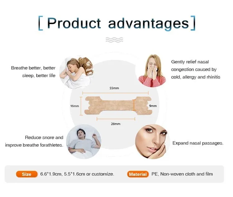 Nasal strips gently open nasal passages so you can breathe through your nose and close your mouth, reducing snoring. Each drug - free, non - prescription nasal strip consists of flexible, "spring-like" bands. Placed correctly across the nose, the bands gently lift the sides of nose to provide: nasal congestion relief due to the common cold or allergies, snoring relief to sleep better, better breathing for people with a deviated septum. Athletes also use nasal strips to reduce the amount of energy needed to breathe during a workout.