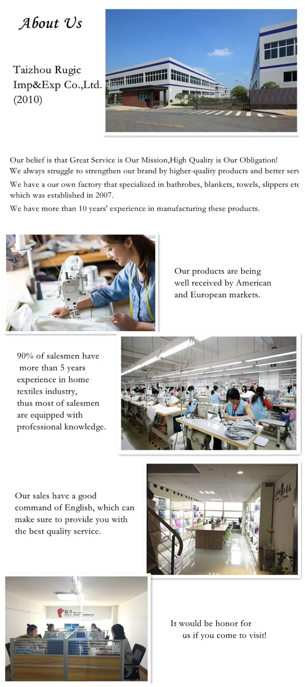 A:Competitive prize; Fashion and popular design; Environmental material and good for health; Good finished and craftsmanship ; Our company is mainly produce bathrobes,our products is very popular in American and European markets;