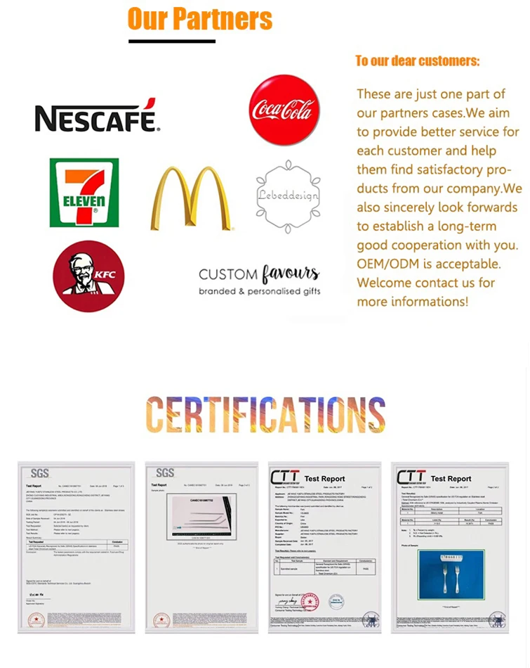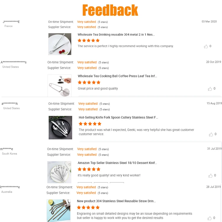 Q2: What is your MOQ? Most of our products are in stock, we can provide our customer a low MOQ but competitive price. Q3: What's the material type that you can provide? 410, 420(13/0), 430(18/0), 201, 304(18/8 18/10), 316(13/0) Q4: About the quality of our product? High levels is mirror polish, medium level is hand polish, low level is tumbling pulish. All for you to choose from. Q5: What certificates have your factory get? FDA, LFGB, SGS, CE/EU, CIQ, EEC, BSCI.