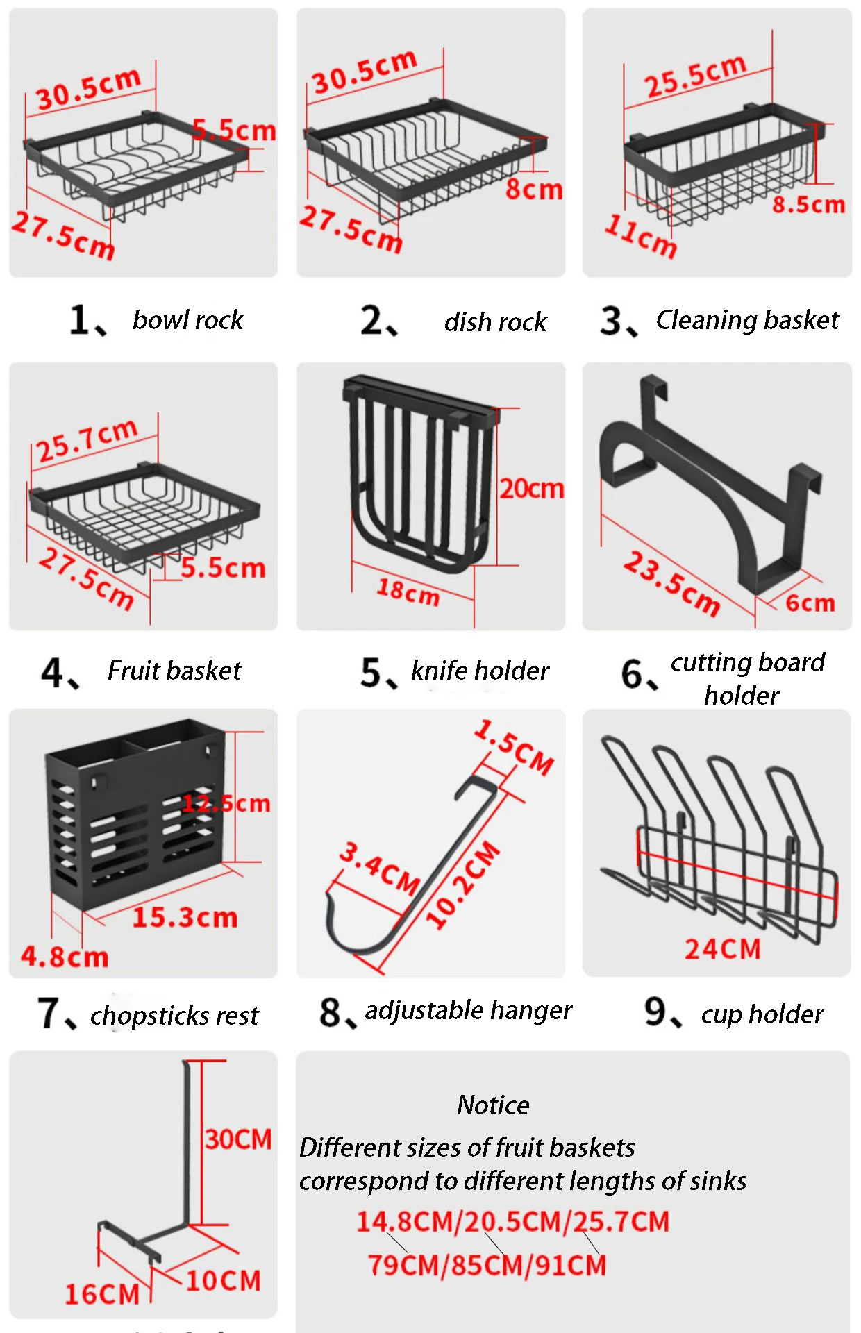 Package Includes: | 1 x Dish Rack + 1 x Plate Rack + 1 x Fruit & Vegetable Basket + 1 x Square Basket + 1 x Chopsticks Cage + 1 x Knife Holder + 1 x Chopping Board Rack + 5 x Hooks+ 1 x cup rack |