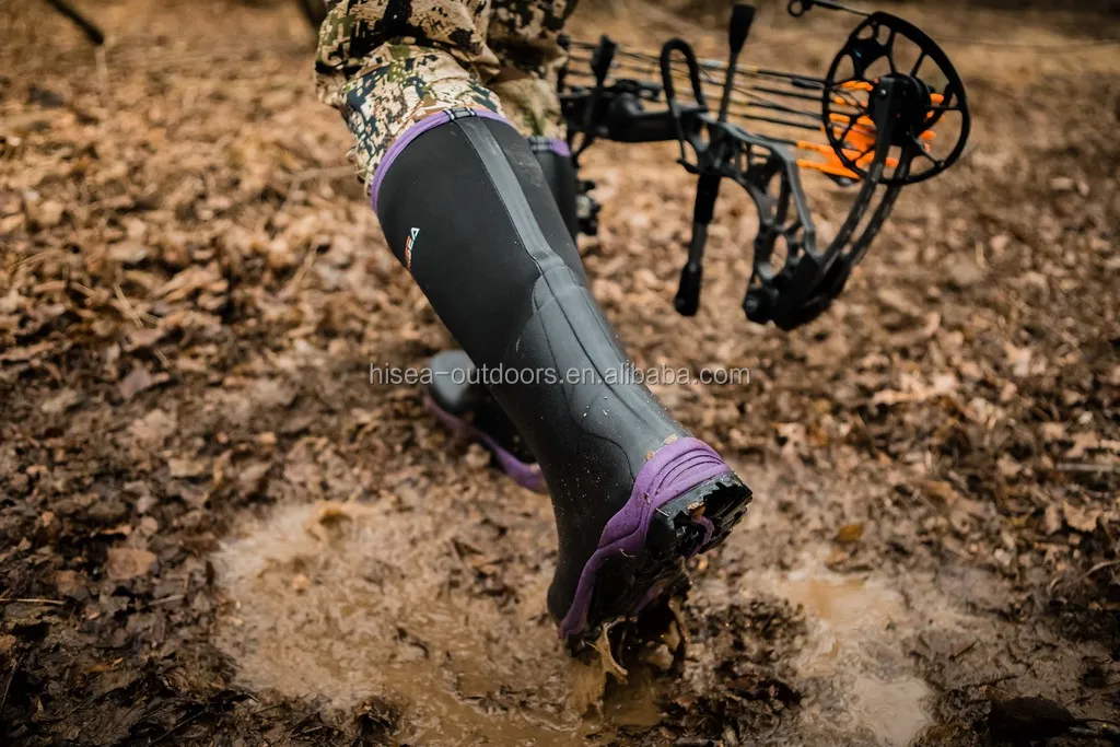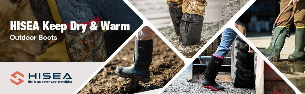 * Conquer wilderness in HISEA boots. These women rubber neoprene boots are designed to be the most durable, protective and comfortable boots for active outdoorsmen. Whether you are working, hunting, fishing, camping, they would keep your feet dry and warm in cold water or mud. * 5mm neoprene and rubber overlays insulate while blocking out moisture, it provides comfort and flexibility with shock absorption and heat retention properties. Keeping you dry against all weather conditions and providing comfort and support for long days on your feet. * Lightweight and breathable air-mesh lining allows air to travel throughout the boots, keeps your feet well ventilated and much dryer than normal boots. The air-mesh is what keeps high-end running shoes cool and dry under intense use. Comfort rated from subfreezing to 65 °F/18 °C. * Lightweight, cushioning EVA midsoles soften every step to provide all-day comfort to your feet. Durable molded rubber outsoles give excellent stability and extra solid traction. Reinforced achilles, heel, and toe areas for additional protection from dangers. * 100% WATERPROOF! Completely sealed rubber shell extends up above ankle for added protection from moisture and dangers. Enhanced rubber shell for additional protection to heel and toe. We love our buyers that each boots will come with one FREE gift and one year quality assurance backed by HISEA!