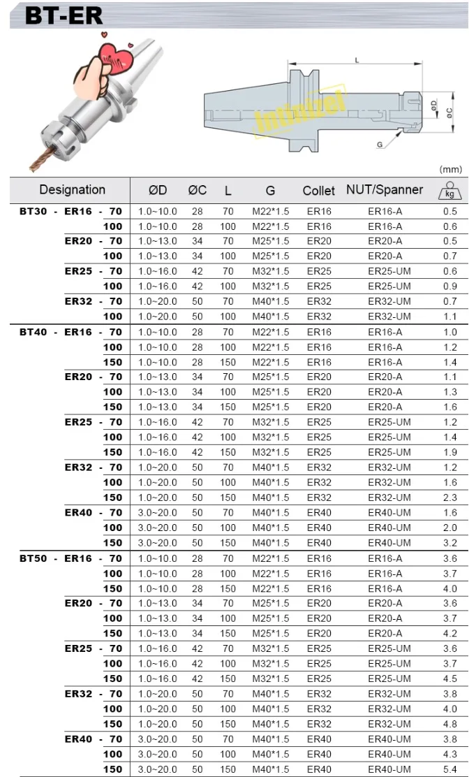 BT Flange Holders Features: 1, All BT tool holder cone comes with pull stud and collet nut 2, BT cone precision≤ AT3, 7:24 3, BT ER collet chucks with AA class high precision ER collet, beat accuracy≤ 0.005mm; when clamp cutters, totally beat accuracy≤ 0.008mm 4, Very smooth inner cone surface 5, Harden surface, last for long time use 6, G2.5 balance test 7, Wearproof screw thread, more loading/unloading times. 8, 20CrMnTi material, carbon-nitrogen co-permeation, enhance the hardness, abrasion performance, fatigue hardness. Carburized depth> 0.8mm