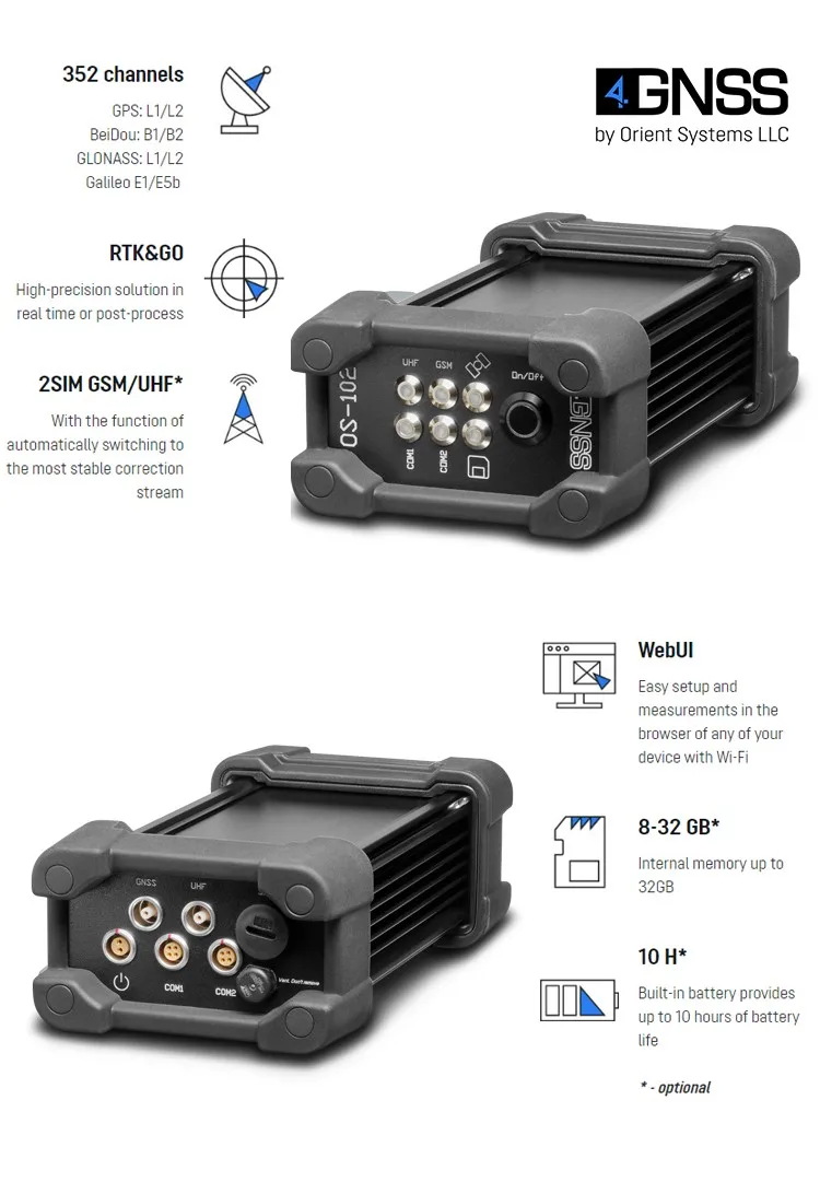 Measurements are recorded in the internal memory of 8 GB (up to 32 GB). Supports RTCM 2.x, 3.x, CMR corrections. Raw data is easily converted to RINEX by the receiver's internal WebUI or PC free utility. WebUI to configure and control the receiver. Optionally includes an internal battery for 10 hours of autonomous working.