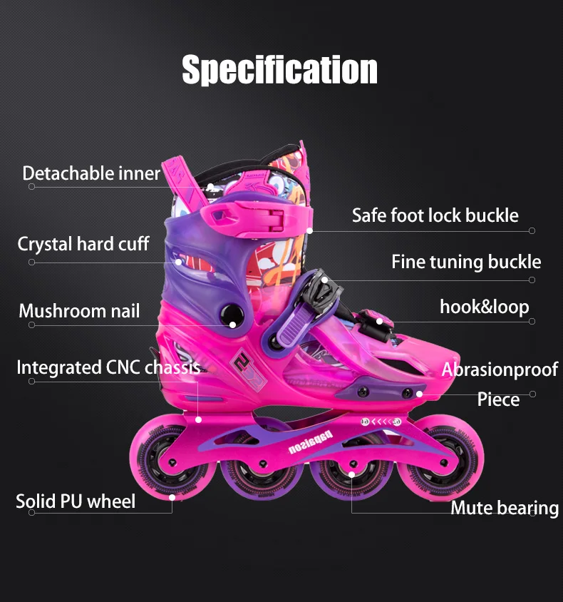 Special | 1.Without shoe lace 2.Triple buckles design 3.Rear Fine tuning size adjustor 4.Detachable brake 5.With detachale abrasionpfoof piece | |||