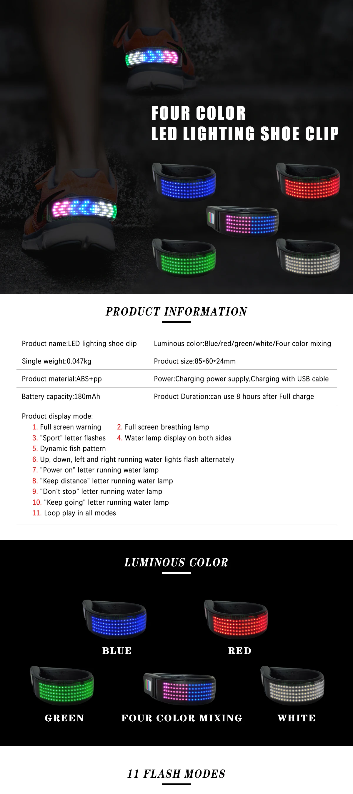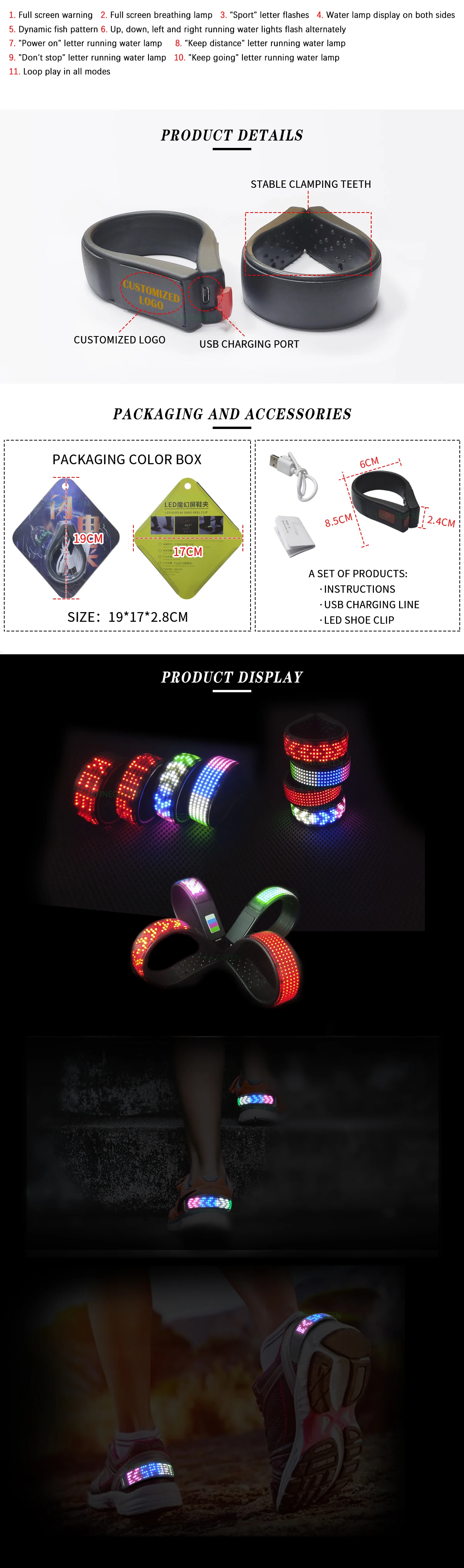 Q:Can I choose different colors of Led Shoe Clips? A:Yes,you can choose. Q:How long can send for the Led Shoe Clips? A:Ready to ship,48 hours shipping Q:What is including in one set? A:Instruction manual, USB charging cable, led shoe clip Q:How can I add my logo? A:Sending your design in JPG,AI,PDF file,we will do pictures for your checking,after confirmed,we will start production. Q:Whind of battery will the led mask using? A:Using lithium battery Q:How long is the warranty? A:1 year Q:How can I pay for the order? A:Online alibaba assurance,bank transfering ,T/T bank transfering Q:Can I get some samples checking? A:Yes,sure,you can choose as you like. Q:Why should I choose your factory? A:First you can see alibaba transaction history,we are top 1 at lighting field. Second we have our own factory,you can come or see vedios on website Third Massive stocks and read to ship Fourth one year warranty
