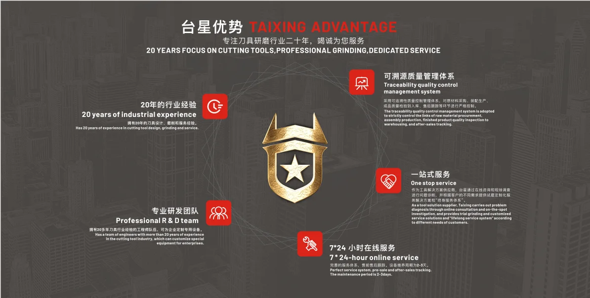 Zhejiang Taixing Intelligent Equipment Co., Ltd. is a comprehensive professional manufacturer specializing in the development and production of tool grinders, special tool grinders and precision machine tools.Our company mainly produces drill grinder, end mill grinder, tap grinder, chamfering machine, saw blade grinder, lathe grinder, universal tool grinder, etc.