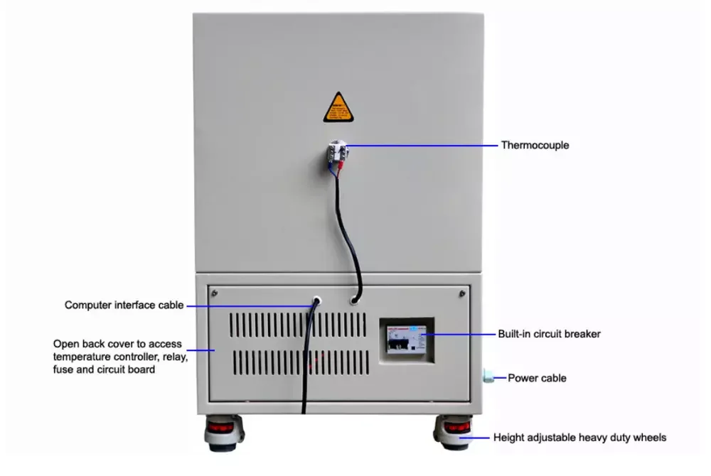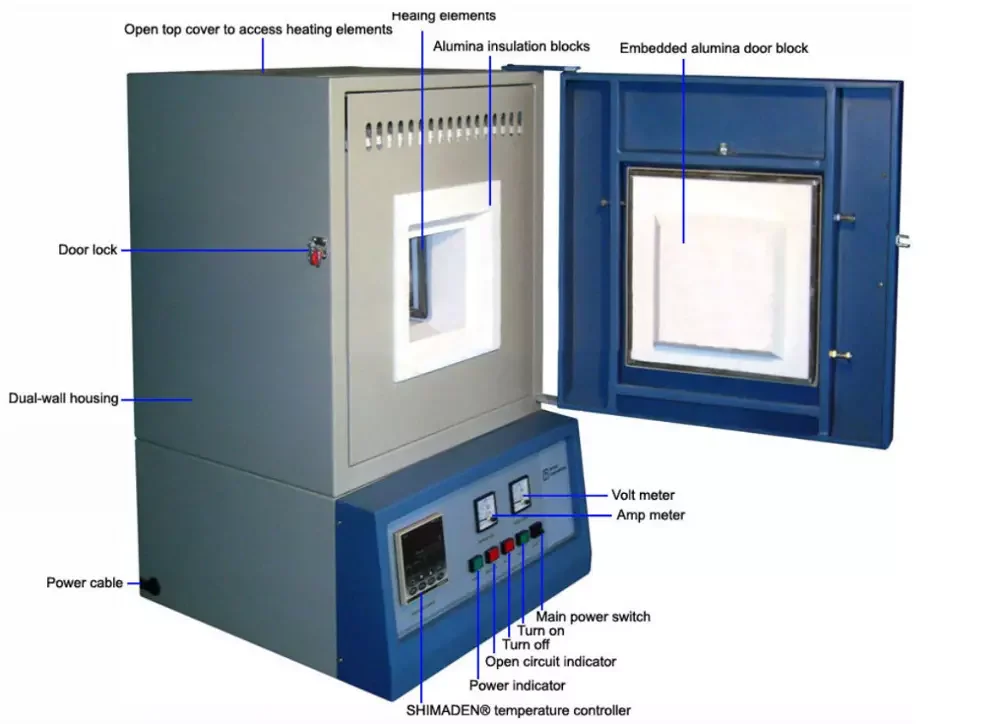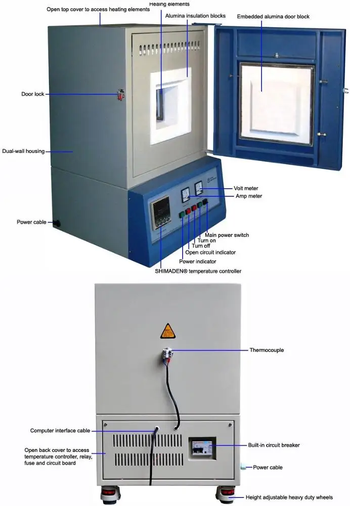 LI-1800Muffle muffle furnaces feature a chamber with Mitsubishi (Japan) high quality grade 1900 alumina fiber insulation and the famous molybdenum silicide (MoSi2) heating elements. A dual-wall steel housing helps minimize heat loss to exterior surface.