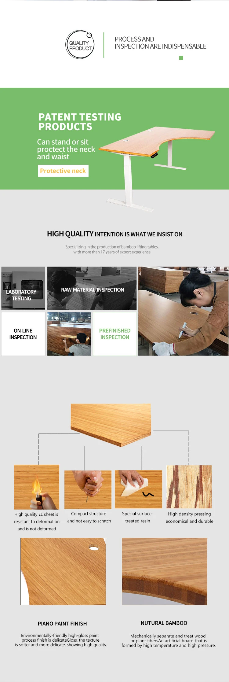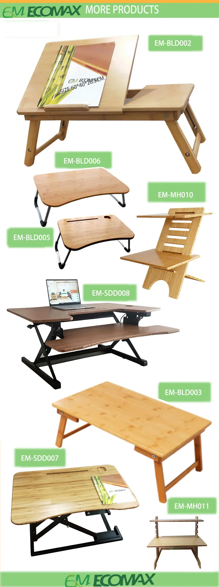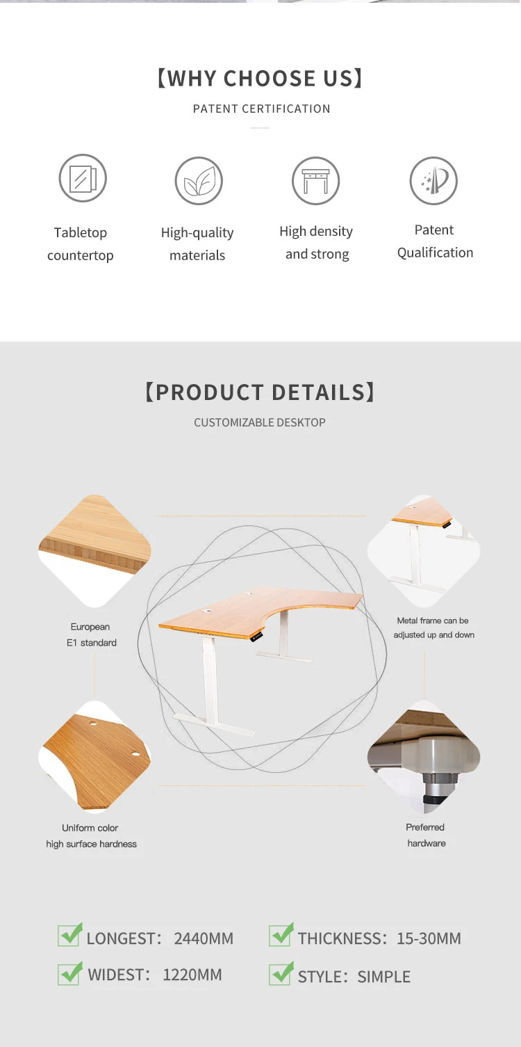 We use 100% MOSO bamboo as table top's construction which is the most eco-friendly and attractive wood . Bamboo has high density, high hardness, More durable than maple and oak or other timbers.with natural and elegant texture grain, reducing eyes strain while providing better viewing experience. We have standard sizes .also can do custom made sizes,shapes,just show us any of your ideas . We have L-carbonized color,D-Carbonized color also can do custom made color stained