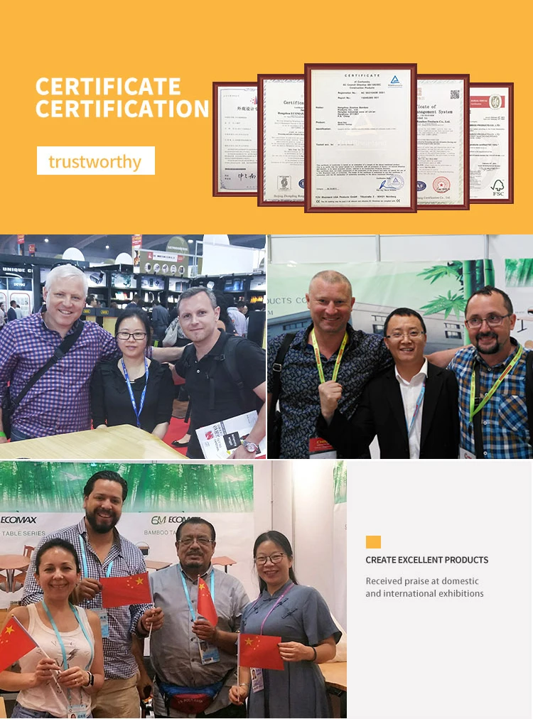 Established in 2002, Hangzhou Ecomax Bamboo Products Co., Ltd is a leading supplier of modern bamboo products that covers an area of more than 70,000 square meters. At only 45km from Hangzhou, and 230km from Shanghai, our company enjoys convenient transport links and is currently exporting worldwide. With several senior technicians and advanced German and Taiwanese equipment,including a pressing production line, automatic UV finishing line and quality control equipment, we can produce over 500,000 square meters of desktops ,furnitures,flooring per annum. Furthermore, having established relations with numerous raw material supply bases in the provinces of Zhejiang, Jiangxi and Fujian, we are ensured of a steady supply of high quality materials. Our company makes every effort to maintain its high level of quality, and inspects raw materials as well as finished products. During production we use European E1-level glues, Zero Formaldehyde F (4 star) glues and German wear resistant UV paint, all of which conforms to environmental protection standards. In addition, all of our quality indexes surpass the Chinese standard LY/T-1573-2000 for environmentally friendly products. Honesty and Reputation' is our principle, and 'High Quality and Customer Satisfaction' our pursuit. If you are interested in any of our products, or are searching for a supplier to fill your OEM order,please contact us to discuss your requirements.