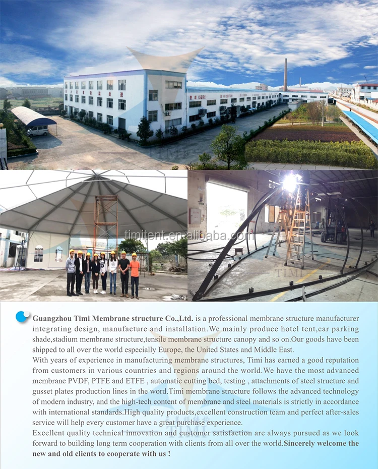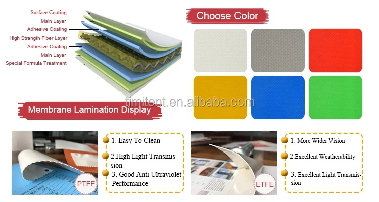 The cover material is PVDF or PTFE.PVDF can last more than 15-20 years.PTFE can last more than 30 years.It have fabric inside,so it very strong,not easy to be torn.