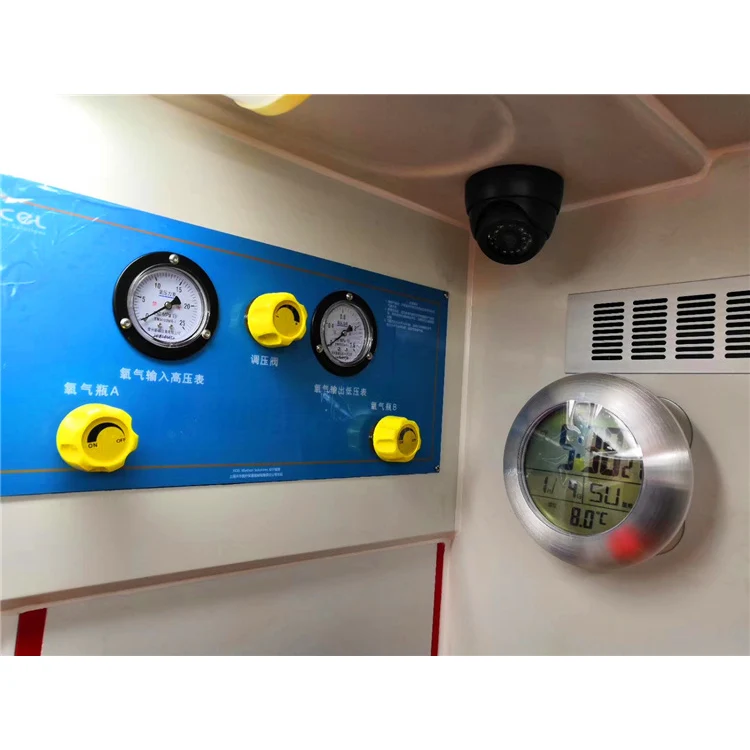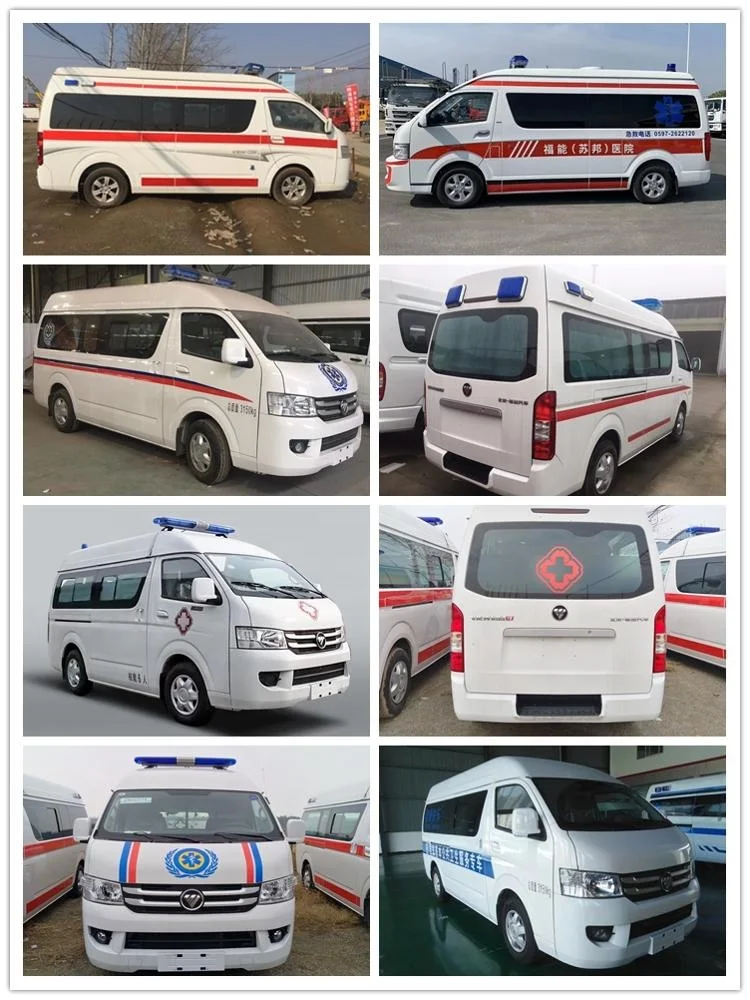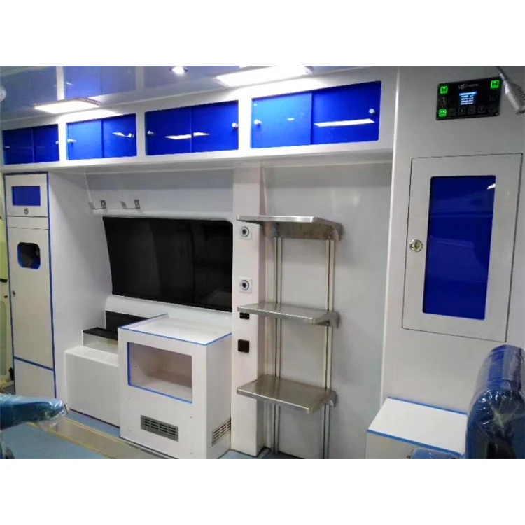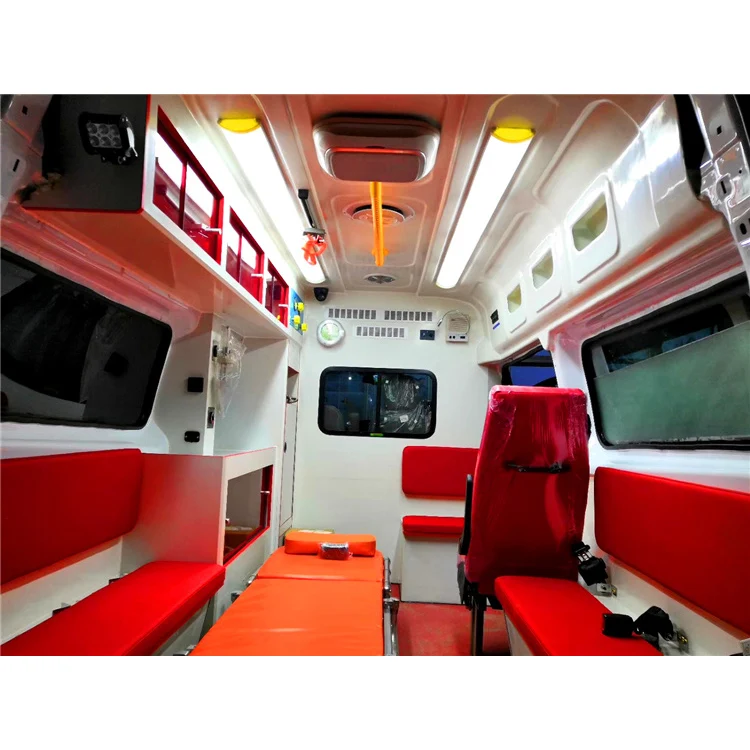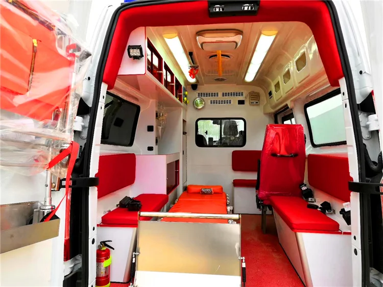 Standard configuration | 1,Long lamp 1pcs ; 2,Automobile stretcher(Portable folding stretcher included) 1pcs ; 3,Portable folding stretcher 1pcs; 4,Oxygen system (Oxygen bottle, oxygen tank, fast interface)1set; 5,Medical cabinet 1set; 6,Working seat /attendant seat 1set; 7,Sterilising lamp 1pcs; 8,Transfusion hook 2pcs; 9,1000W Inverter 1pcs; 10,External power source 1set; 11,Air ventilator 1pcs; 12,12V Spotlight 2pcs; 13,220V Outlet 2pcs; 14,Power board (Viewing window included ) 1set; 15,Partition sliding curtain (Viewing window included) 1set; 16,Rubber floor covering 1set; 17,Garbage van 1pcs; 18,Cross mark 1pcs; 19,Air condition1set | |||