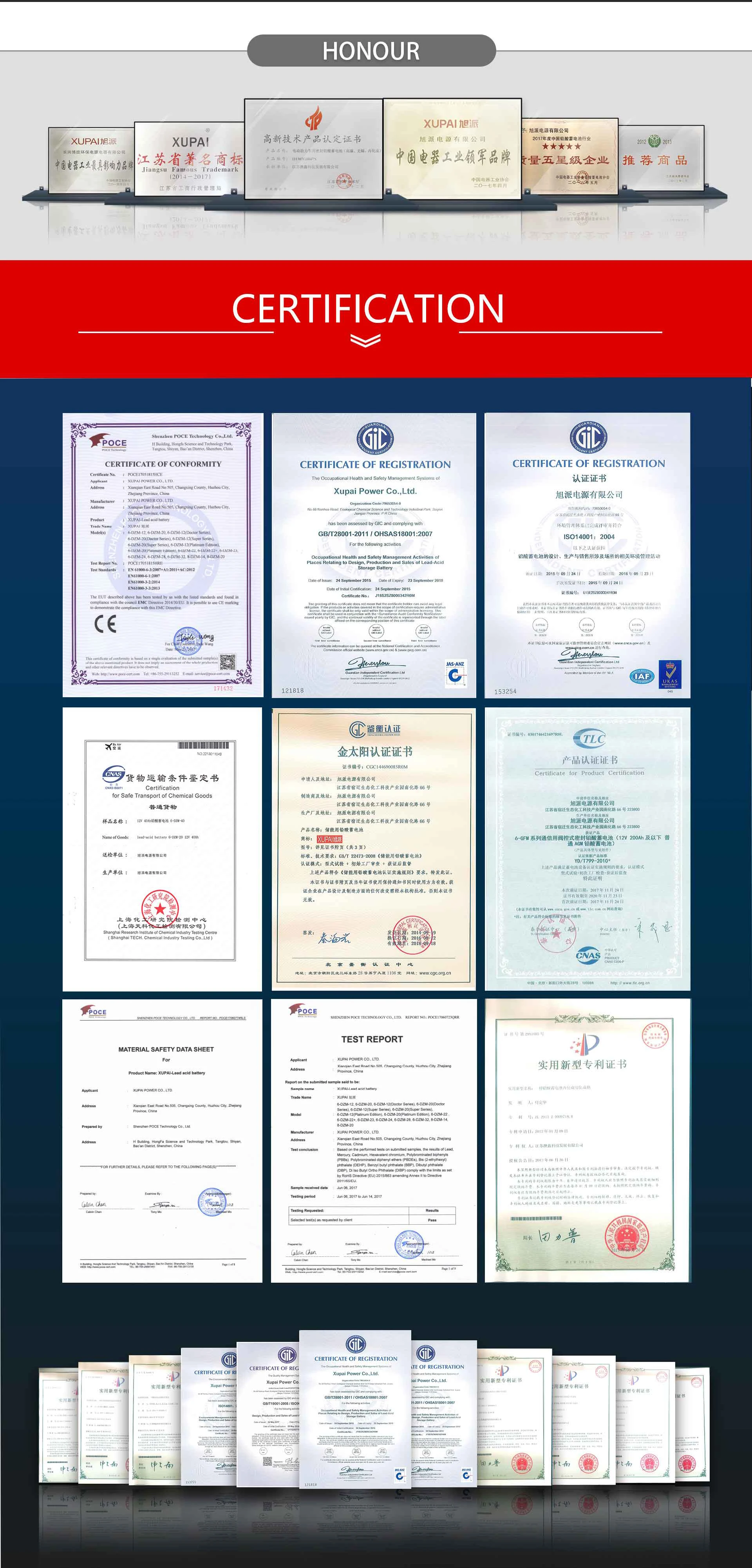 XUPAI Battery, the leading supplier of new energy products, the brand of high-quality electric vehicle batteries, is specialized in R & D, manufacturing, sales and service of high-tech enterprise.XUPAI battery has always been adhering to the business philosophy of quality, integrity, service,and development, which keep continued leading position in global suppliers of new energy products. XUPAI Battery has abundent experience with product development and manufacturing in the fields of power batteries, storage batteries, and UPS batteries,which is one of the few manufacturers that master container formation high-tech without cadmium,all batteries use container formation technology.Those batteries are non-cadmium and arsenic-free, green and eco-friendly, which is the global leading products among similar lines. XUPAI has 4 battery branch brands: XUPAI,JINRICHAO,SHENGMING and BOLANG.XUPAI has three major production bases in China:Changxing,Zhejiang(Headquarters)-Changxing boneng environmental protection electric appliance co., ltd,which covering an area of 33,000 square meters. Suqian,Jiangsu(Production)-Xupai power Co., Ltd,which covers an area of 666,700 square meters.Yifeng,Jiangxi(Production)-Jiangxi yatai electric appliance Co.,Ltd,which covers an area of 200,010 square meters.Jiangxi hetian new energy technology Co.,Ltd,which covered an area of 200,010 square meters.