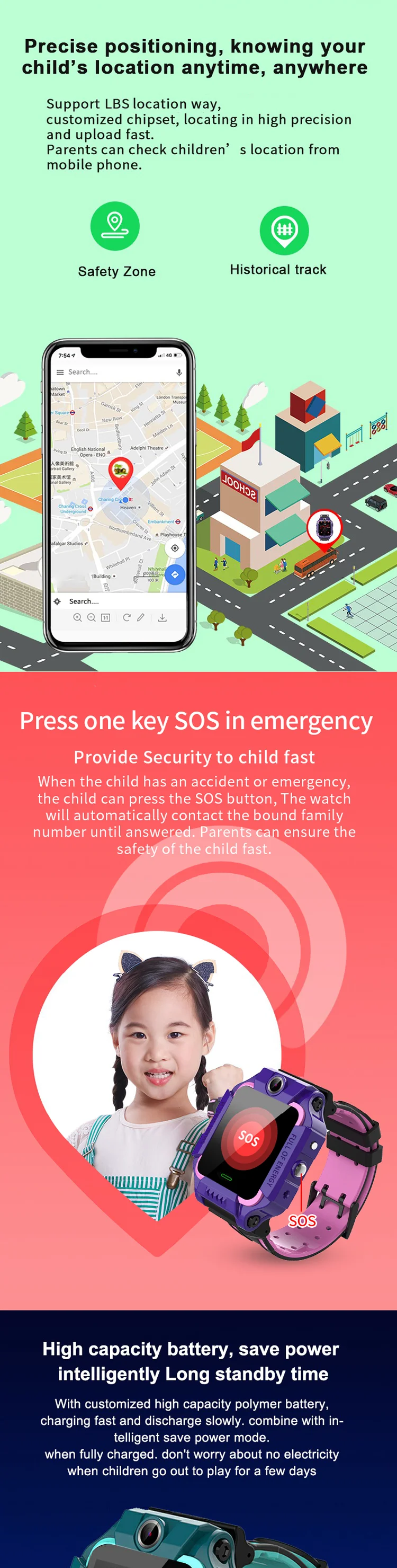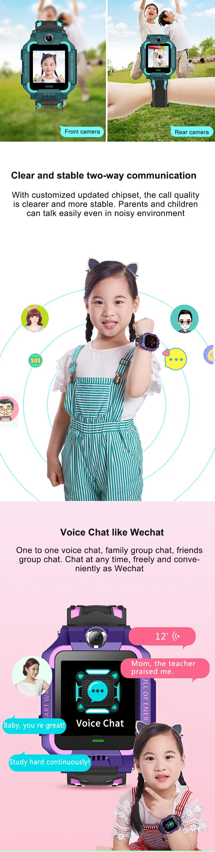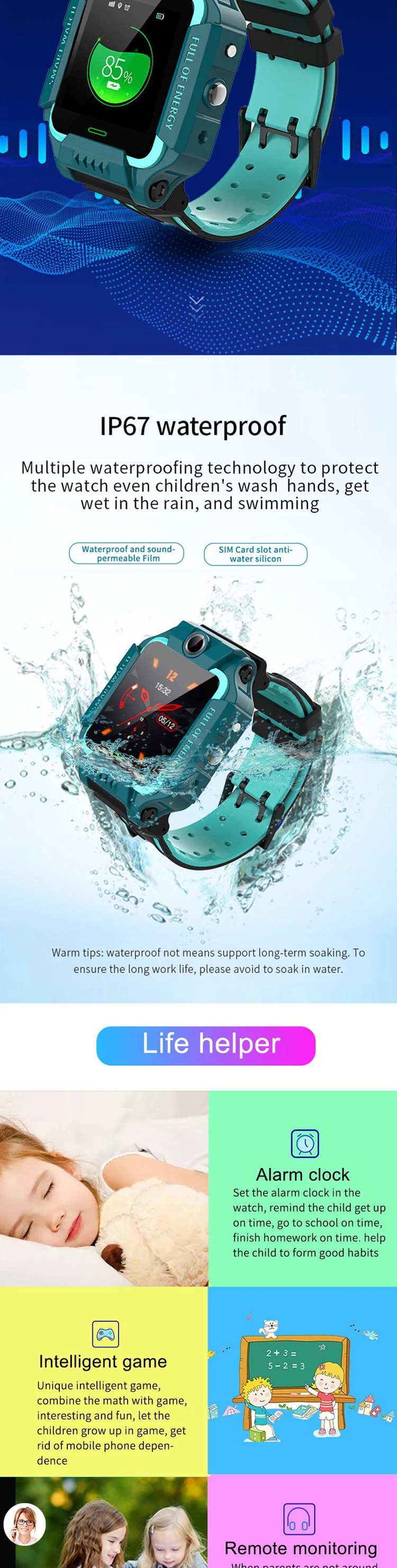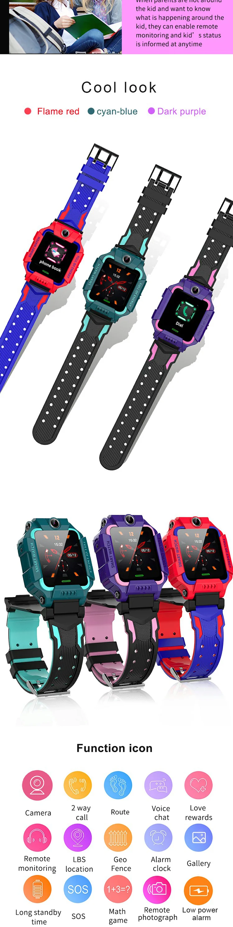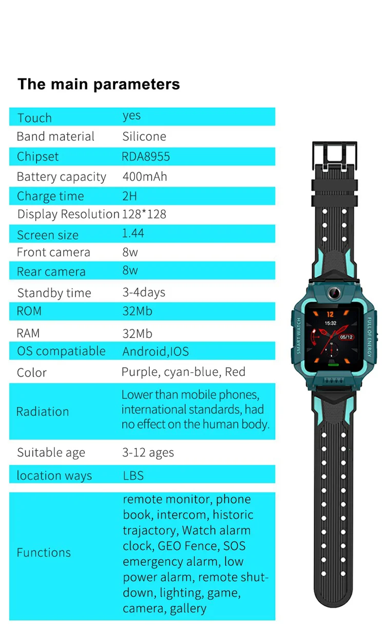 Funtion: Dual camera, Mobile Phone client service plat-Form, Dual control mode, GPRS real-time Positioning, tracking, phone book, intercom, footprint, watch alarm clock, Security area, SOS emergency alarm,low power alarm, weather forecase,remote shutdown,Theme,stop-watch,independent dialing