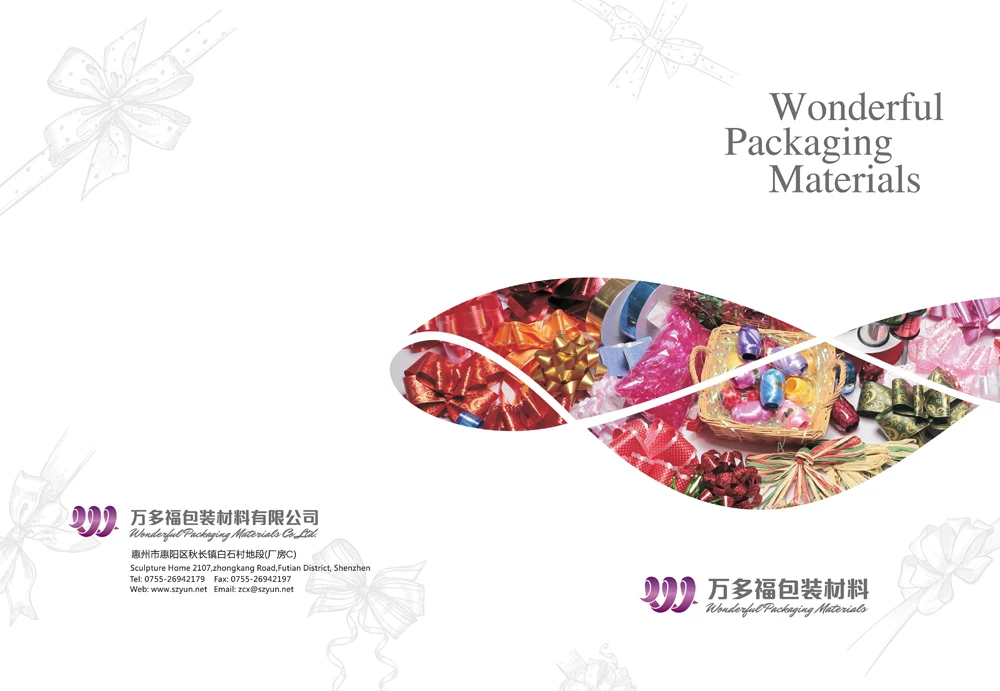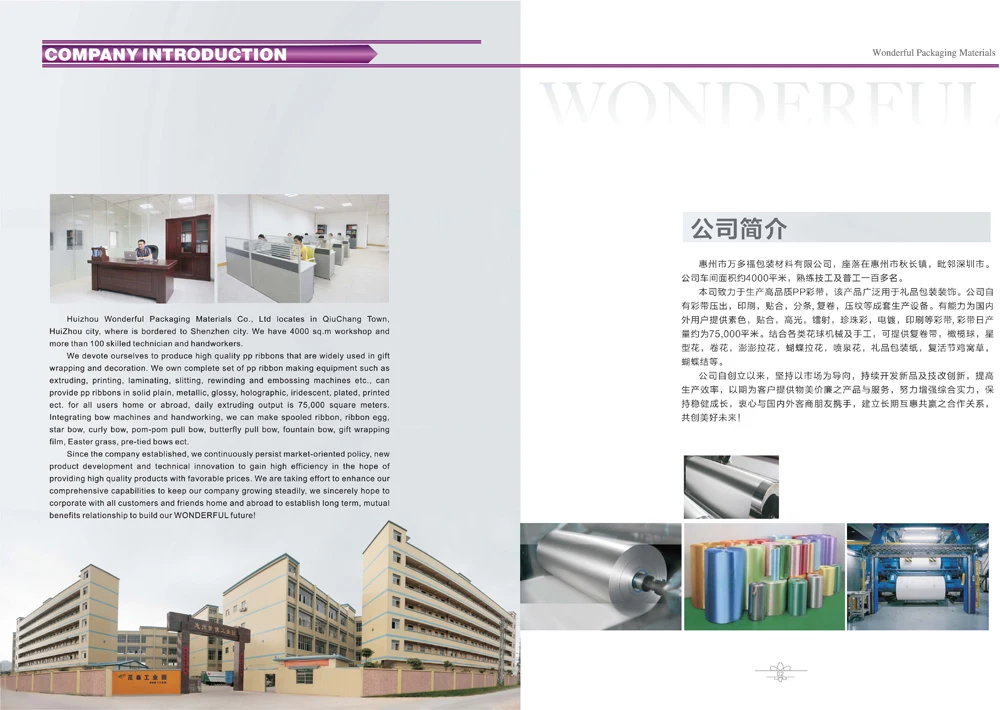 Huizhou Wonderful Packaging Materials Co., Ltd locates in Qiuchang Town, Huizhou city, where is bordered to Shenzhen city. We have 4000 sqm workshop and more than 100 skilled technician and handworkers. We are a professional manufacturer and major exporter in all kinds of ribbons and bows.