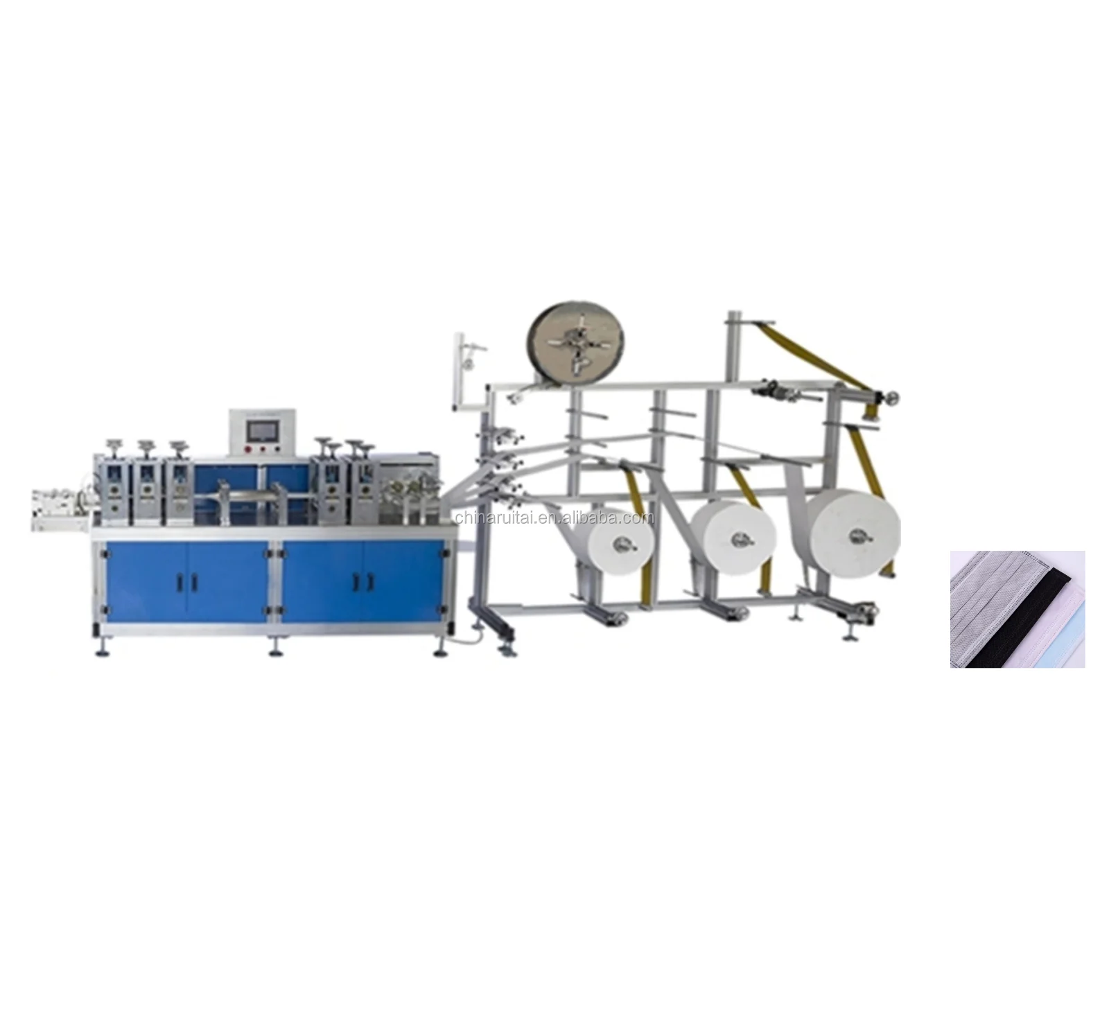 This machine can produce 1-4 layers of non-woven body masks, mask body length of 125-180 mm and width 80--110 mm. The thickness of the mask can be adjusted within a certain range. The length of the nose wire can be adjusted arbitrarily. Non-standard length can be produced in the case of changing the mold. It can produce single or double nose wires masks.