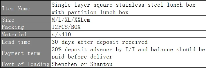 Single layer square stainless steel lunch box with partition lunch box