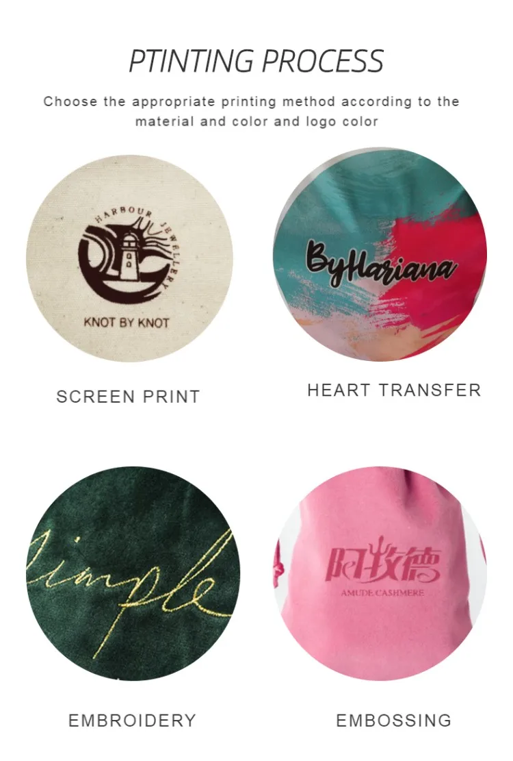 4. Logo can be printed on the bag, including watermark, silk screen, offset, ink,heat transfer, bronzing, silver stamping and embroidery, and silk screen can also be printed on the ribbon