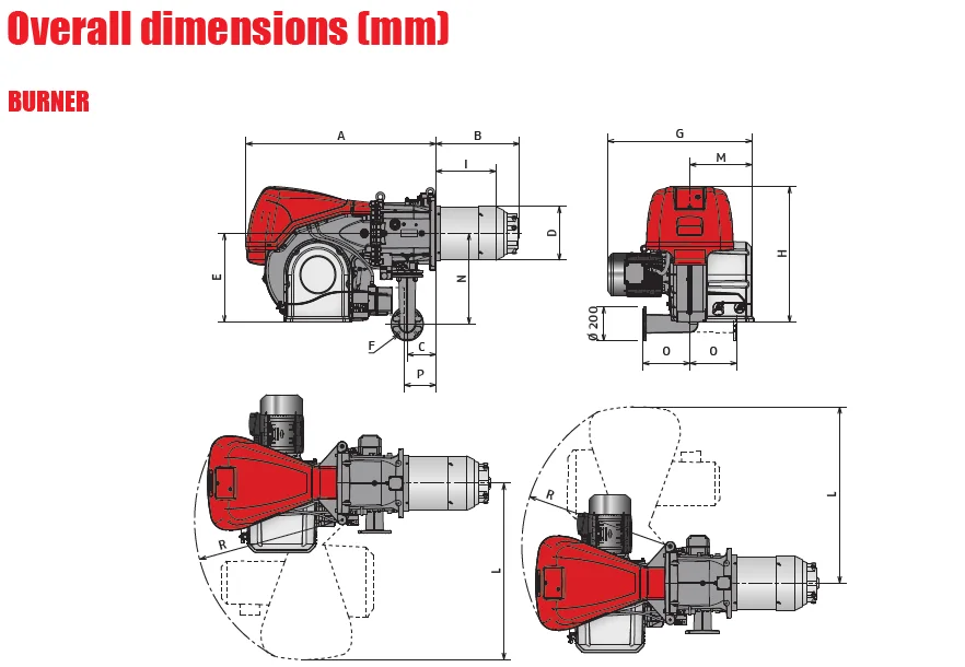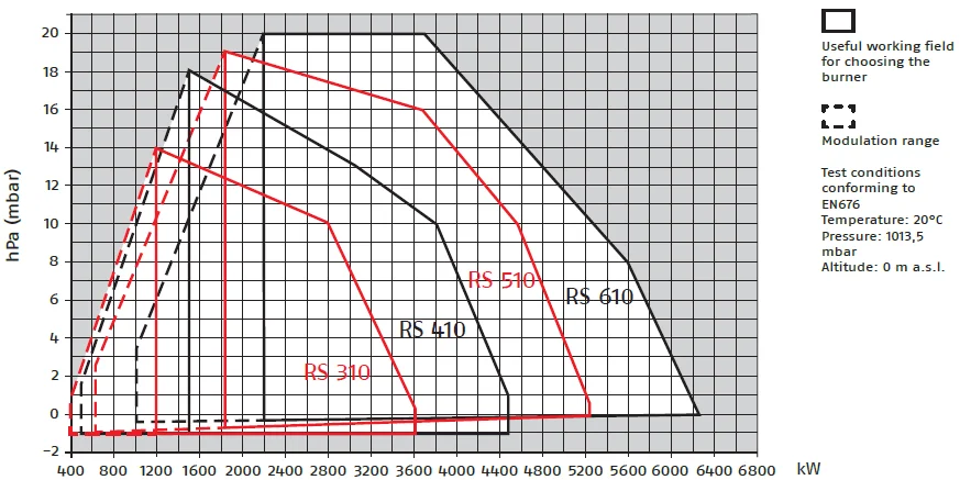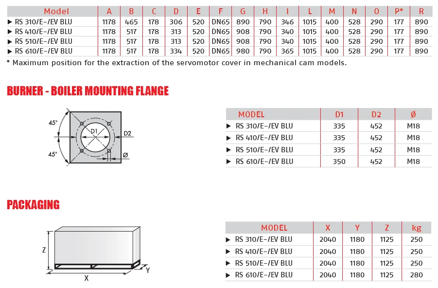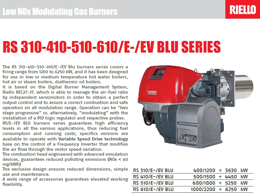 Original Riello RS 310 410 510 610/E /EV Blu burners series covers a firing range from 1200 to 6250 kW