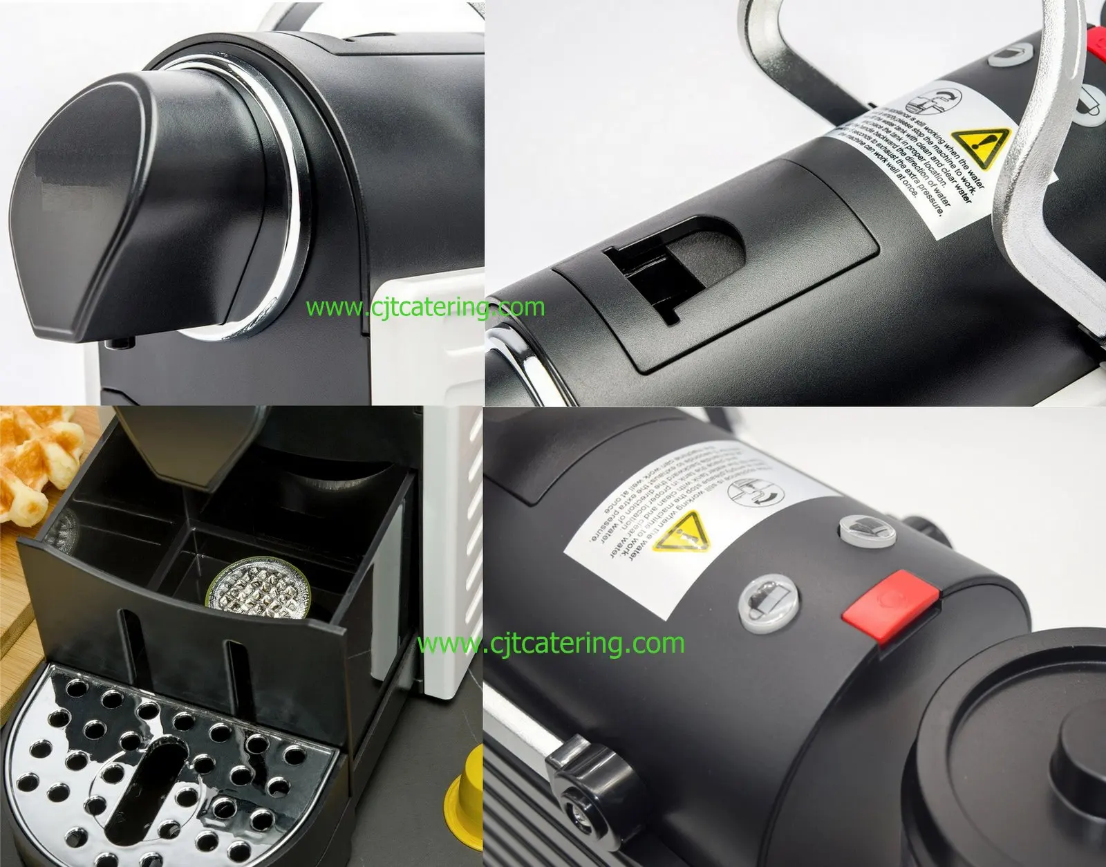 •For all NESPRO size compatible capsules, Lavazza Point, Lavazza Blue and Caffitaly capsules and similar capsules(not all in one) •Manual brewing buttons, Espresso/lungo, auto stop •Capsule loading and dropping by lever easily •Adjustable cup base for small cup and big cup •Energy saving function, automatic switch off after 10 minutes. •ON OFF switch for safe operation • Manual discharge pressure by easily pressing the handle backward • Re-programable automatic control the coffee volume(memory function) •Italy ULKA /DEFOND pump 20 bar •Used capsules drawer capacity: Max. 15 pcs