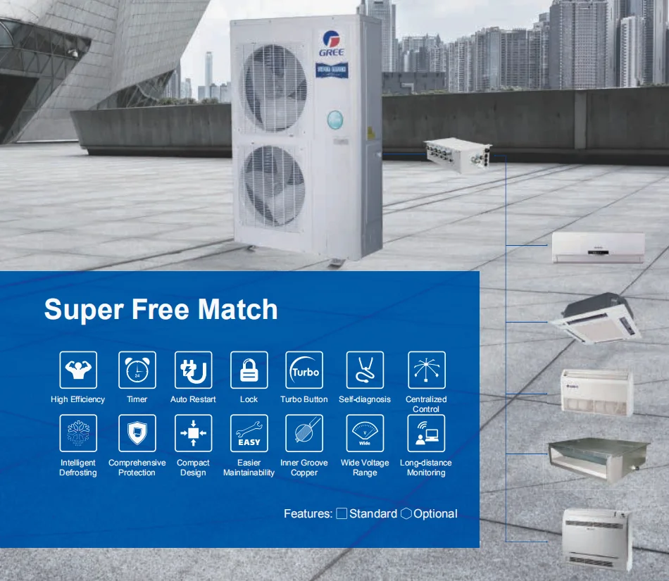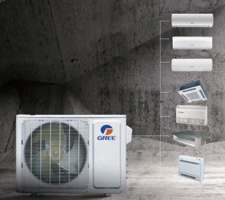 Gree free match is a kind of mini vrf systsem, multi split system, multi zone system and multi head system. Here you can choose the indoor unit style acording to the inner decoration, concealed ceiling duct type, console type, wall mounted type, cassette type( 4 way cassette, 2 way cassette, 1 way cassette), and floor ceiling type.