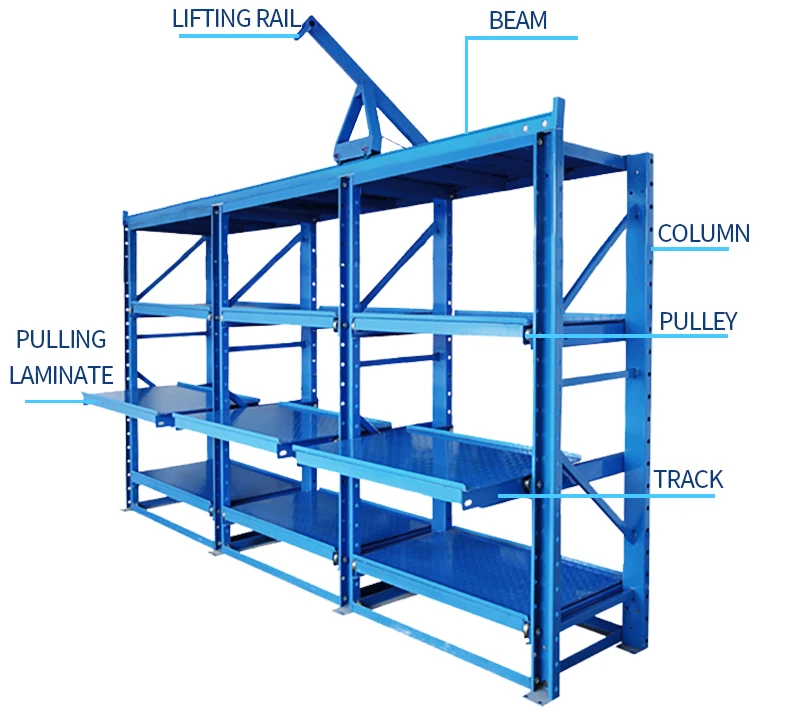 Structural features 1. Combined assembly, mainly including column piece, guide groove, drawer layer, pull rod, positioning pin, etc. it is connected by bolts, and the structure is stable, safe and reliable. It is generally used in rows; 2. The drawer plate is mainly composed of slide rail and drawer plate. The drawer plate is composed of frame and steel plate welded by rectangular tube and bending parts.Each slide rail is fixed by two bearings at the front and back, which can roll freely in the guide groove with small resistance and can be easily pulled out by one hand; 3. For the sake of safety, we designed the locating pin and limiting pin at the drawer disk to ensure the safety of the drawer when it is pulled out; 4. The load of light drawer is 200-1200kg, and that of heavy drawer is 800kg-2000kg; the semi open drawer design is combined with crane or trolley to access mold, which can increase the use of corridor space in the factory; it can be installed with crane, which is convenient for lifting, lowering and moving of heavy objects, with a load of 500kg; 4. Drawer type shelf covers less space, has heavy layers, detailed classification and simple operation. It can be extended by unlimited combination according to operation requirements. |
