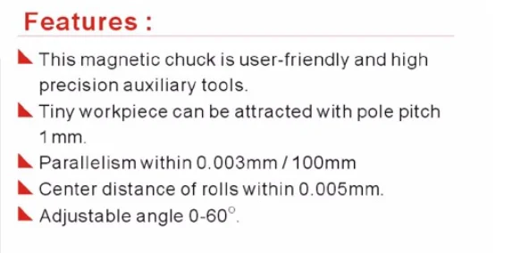 1. Sine plate with fine magnetic chuck can fix tiny parts firmly on the chuck with pitch is only 1.5mm