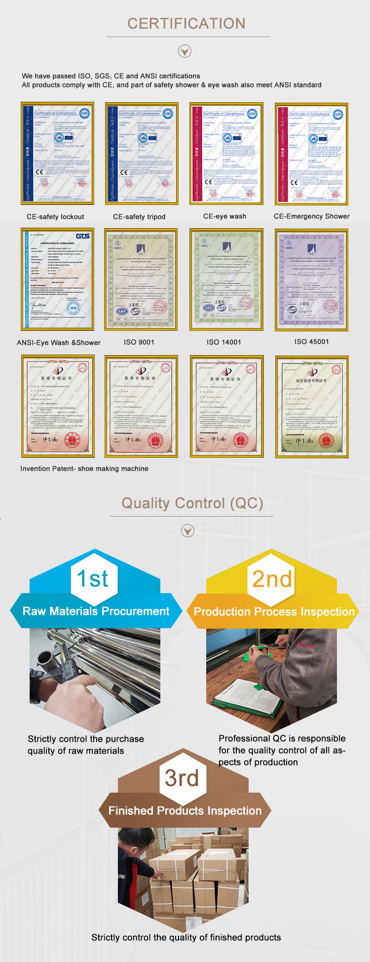 All products comply with CE, and part of safety shower & eye wash also meet ANSI standard. 100% QC during production and before shipment.