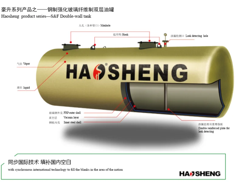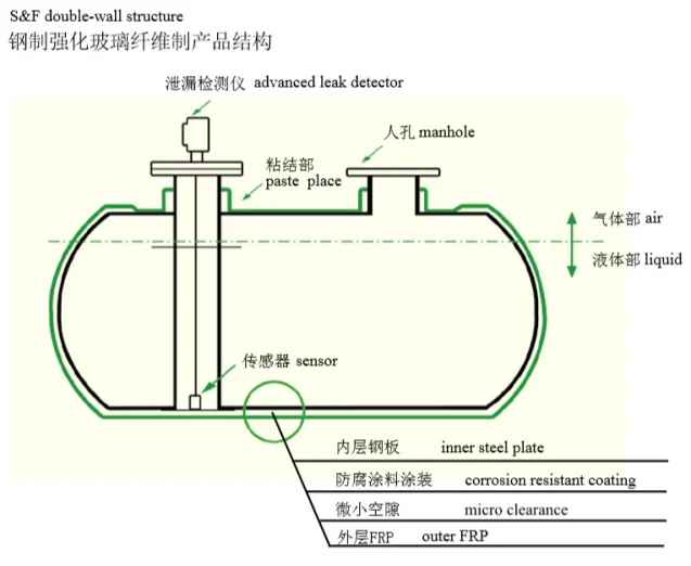 The main steel body of S&F Double-wall tank (with the full name of "steel and FRP double-wall tank") is called "inner shell", and the FRP protecting layer is"outer shell".