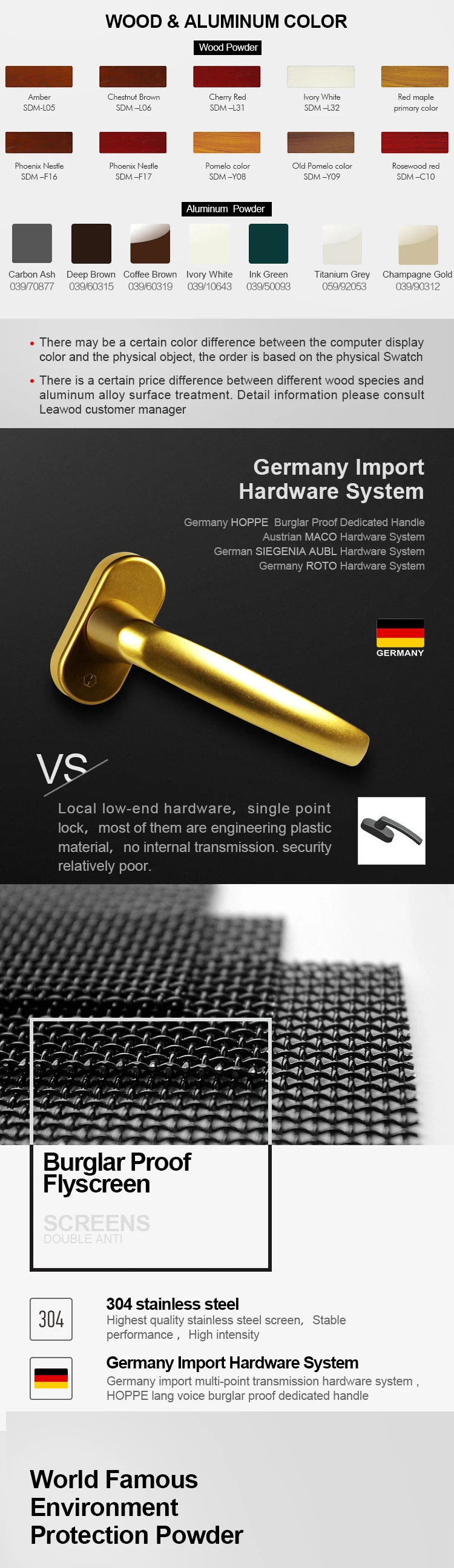 A:10 years quality warranty can be provided, including frame unfading nor peel-off, hardware, and accessories working properly under correct operation. 10 years warranty for German hardware. If there are quality issues, Guaranteed to Immediate delivery of replacement parts with available in stock, and if be out of stock, delivery time should depend on material ordering time which is normally 10-15 days.