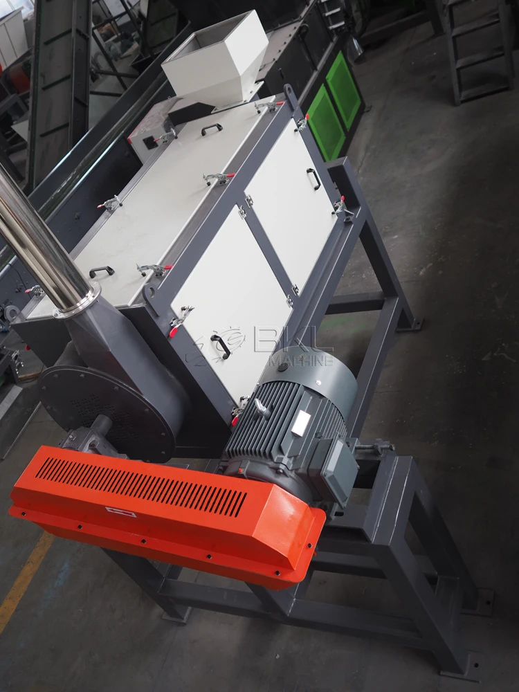 * Horizontal dewatering machine( Dehydrator):This machine is mainly used for the cleaning of waste plastic after mechanical dewatering and drying, the spindle through high speed rotating threw the plastic and water to the screen, water releases by screen, while the plastic is from the outlet to be out of the machine enters into the next procedure. The machine has a good drying effect and high energy efficiency. The blade is made of high wear-resistant materials, can be replaced more conveniently.