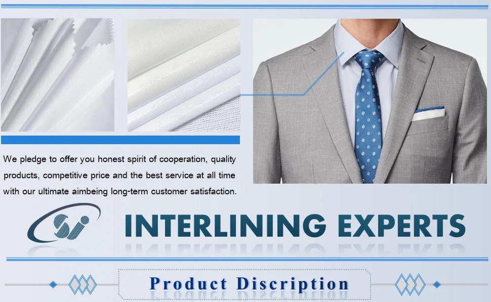 Product Characteristic | a. Perfect hand feeling after fusing, very plump,suitable for most fabrics bonding. b.Good bonding strength and dry cleaning resistance. c.Good laundry resistance up to 40 ℃ d.Eco-friendly, formaldehyde<75ppm, shrinkage<2% e.PA coating : Shinning coating appearance. |