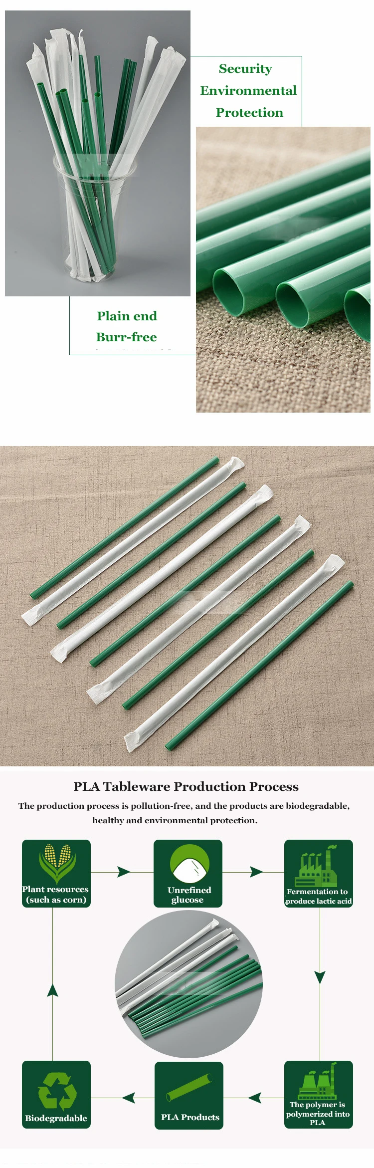 Our Advantages 1) made from 100% PLA Polylactic acid 2) 100% biodegradable 3) Healthy,Nontoxic,Harmless and Sanitary 4) can be recycled and protect the source,no preservative 5) from the nature and back to nature