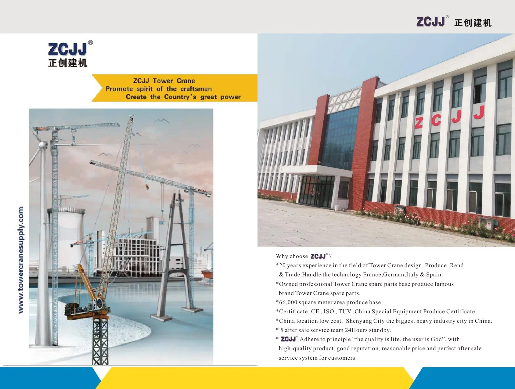 ZCJJ tower crane, one of the biggest supplier and export of tower crane in China. Luffing crane , topless crane , derrickcrane along with the spare parts for them.With 20 years' experience on tower crane production, rent and export experience, Having a long-term and good cooperative relationship with China's most famous manufacturer of tower crane like YONGMAO, SANYO, SCM, Zoomlion,Liebherr, GJJ,etc. We can offer you the best quality original tower crane and spare parts with most competitive price and best service