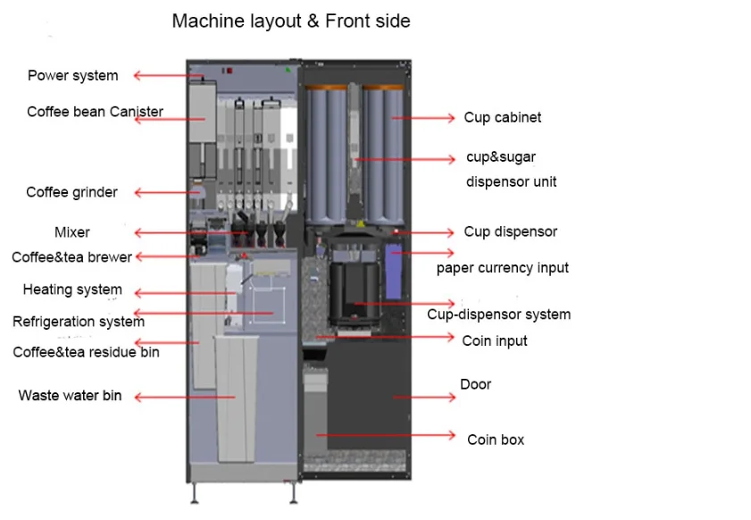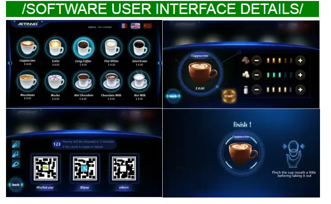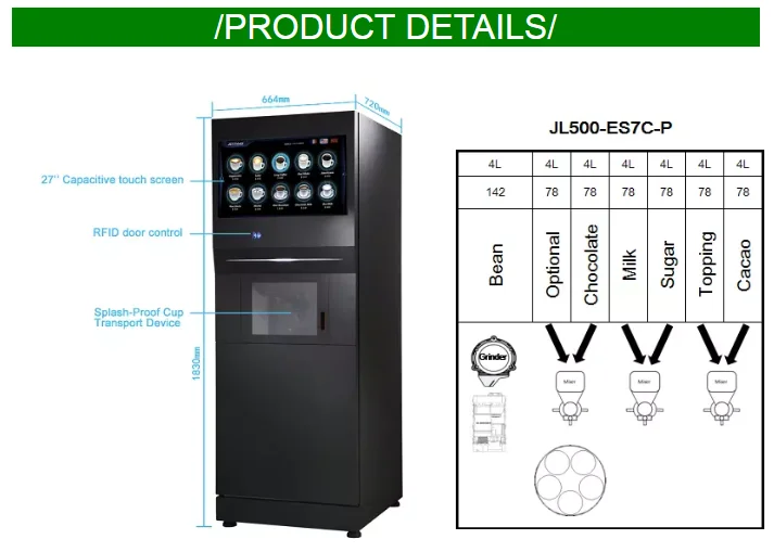 JL500-ES7C is a professional coffee machine for vending market. It supports many kinds of payment systems, which are easy for vending. And more than 20 kinds of drinks can be produced from this coffee machine. With 27inch touch screen, the coffee vending machine is user friendly and easy to operate it. It will be good for public channel. "Take it and go" coffee is easy to make it.