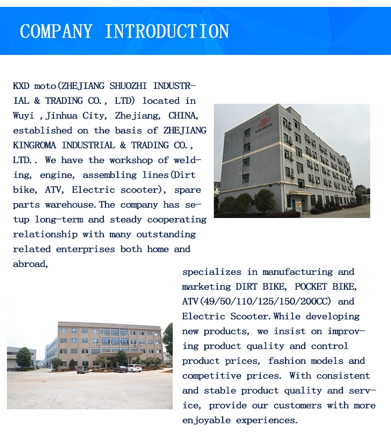 KXD moto located in Wuyi city, Zhejiang province, by car: 30 mins from Yongkang or Jinhua, 1 hour from Yuwi, by high-speed train: 1 hours from Hangzhou, 2 hours from Shanghai.