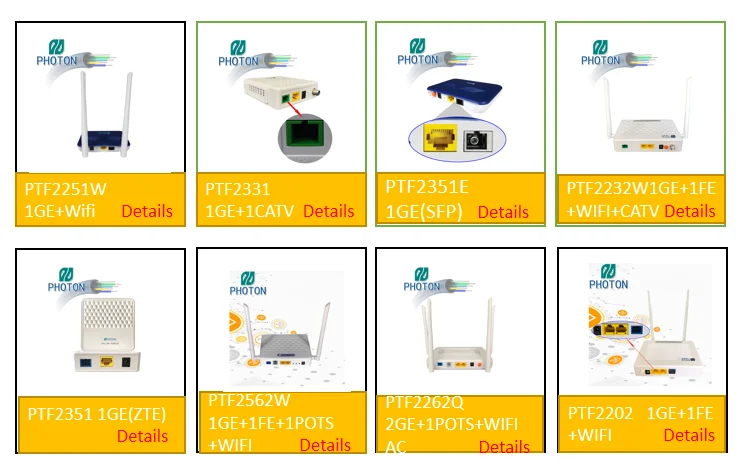 Fibra optica 1GE+1FE+1POTS+WIFI ONU catv gpon ont PTF2562B is designed for meeting the multi-services needs of fixed network operators or cable operators, and widely used in FTTO (office), FTTD (desk), FTTH (home) broadband access and CATV ,video surveillance and other requirements. It is based on mature GPON and Gigabit EPON technology, and has high ratio of performance to price, stable, cost-effective, high reliability, easy management, configuration flexibility and good quality of service (QoS) guarantees. It is fully compliant with GPON and EPON technical regulations such as ITU-T G.984.x, IEEE802.3ah and technical requirement of GPON/EPON Equipment from China Telecom. Small size dual mode ONU can automatically detect OLT and switch PON mode, it can be used as GPON or EPON.