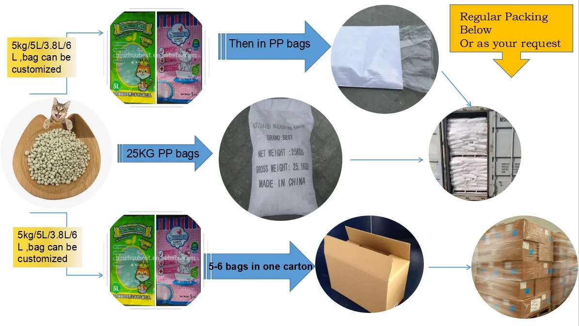 1). The cat litter is made of highly absorbent and non-toxic bentonite. It lets you scoop odors away, leaving your litter box clean and fresh. Its special clumping granules quickly absorb liquid while lasting weeks longer than conventional litter. Your cats will be delighted at the natural, hygienic and fast clumping product. 2). Ingredients: 100% sodium bentonite 3). Processing scientific formula and advanced refining. 4). The cat litter is crafted with strong aggregation,odor absorption,high water absorption,antibacterial,being condecive to the growth of animal health, and family environmental health. 5). When the pet discharge dirt, the litter will be fast group,making smell of urine and the urine contained bacteria in the consolidation of small adsorption,completely non-smell,keep the ususlly clean.
