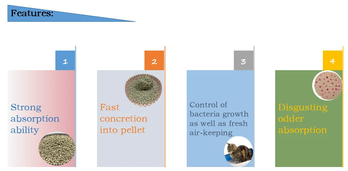 * 1)Strong adsorption ability * 2)Fast concretion into pellet * 3)Distusting odder absorption * 4)The control of bacteria growth as well sa fresh air-keeping * 5)Benificial to the health of house pets(such as cats)