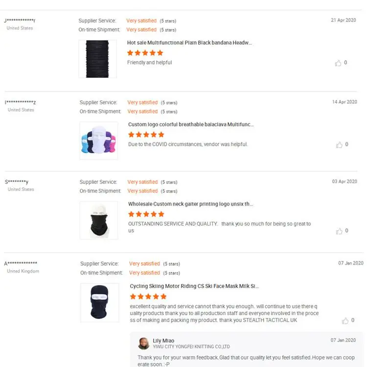 Our main products are tube bandana,triangle tube bandana,square bandana,neck warmer,sports mask,sports hat,beanies,earmuff,eye .mask, scarves, gloves, air sofa, bag, baby products etc. Since we site in Yiwu, the biggest commoudities city, that means we have the best competitive market.