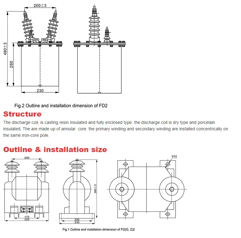 FD(G)2, FD(Z)2 Discharge coil outdoor and indoor discharge coil is single-phase, cast resin insulated used in doors or outdoors connected with high voltage parallel connection capacitor group. When the capacitor group is cut off from the system, it can take only five second to reduce the residual voltage of the capacitor group from 2Un to below 50V. When operating normal, the secondary winding is used as voltage indicator and the residual Winding is connected as split triangle. If the pole of capacitor partial breaks down, it would bring the zero sequence voltage to drive relay protection gear. The product is small, light, little partial discharge energy and high resistance to over voltage. It is a new product for superseding the oil type discharge coil.