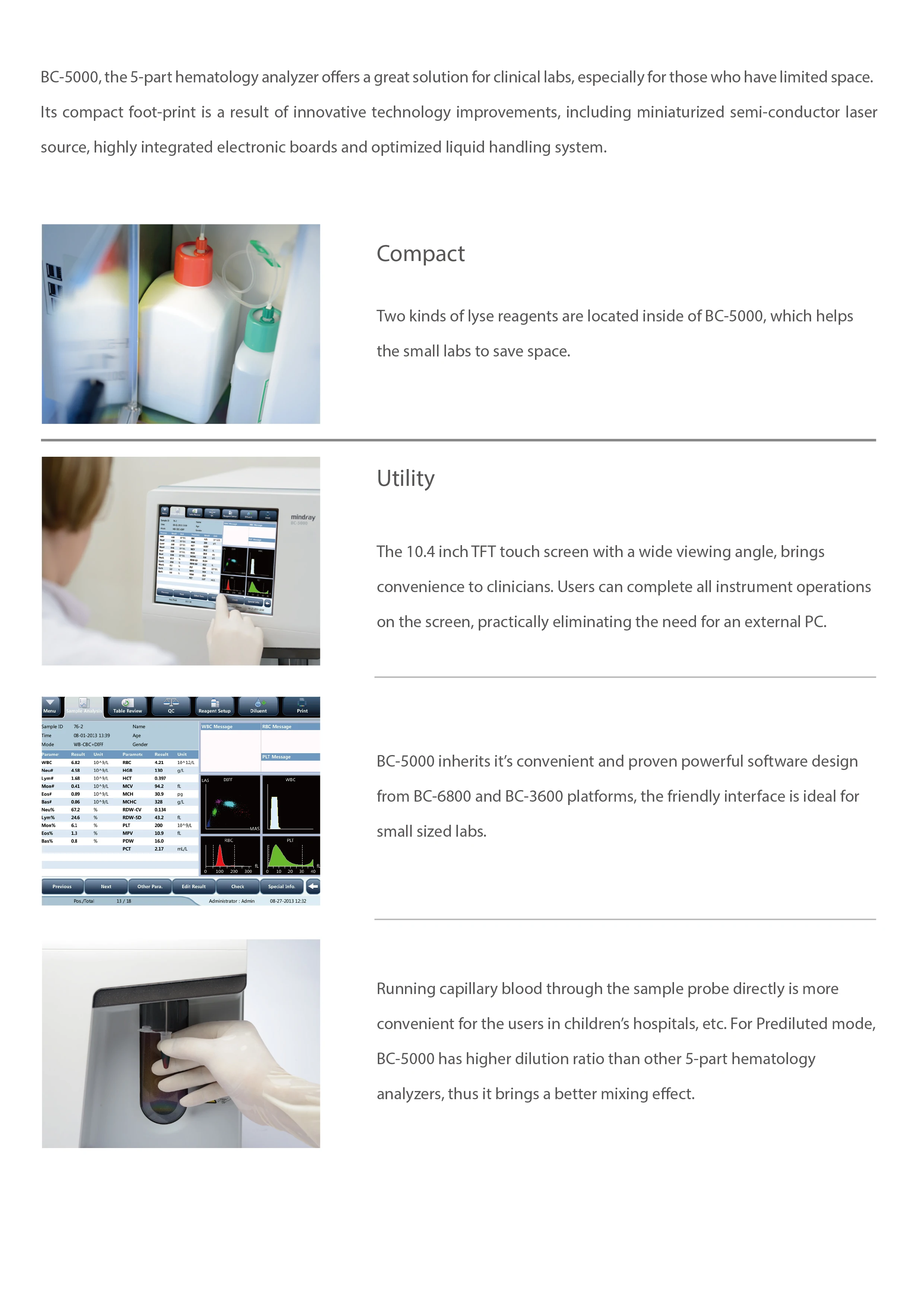 Parameters | 23 parameters: WBC, Lym%, Mon%, Neu%, Bas%, Eos%, Lym#, Mon#, Neu#, Eos#, Bas#, RBC, HGB, HCT, MCV, MCH, MCHC,RDW-CV, RDW-SD, PLT, MPV, PDW, PCT 3 histograms for WBC, RBC and PLT 3 scattergrams for WBC differential | ||||||