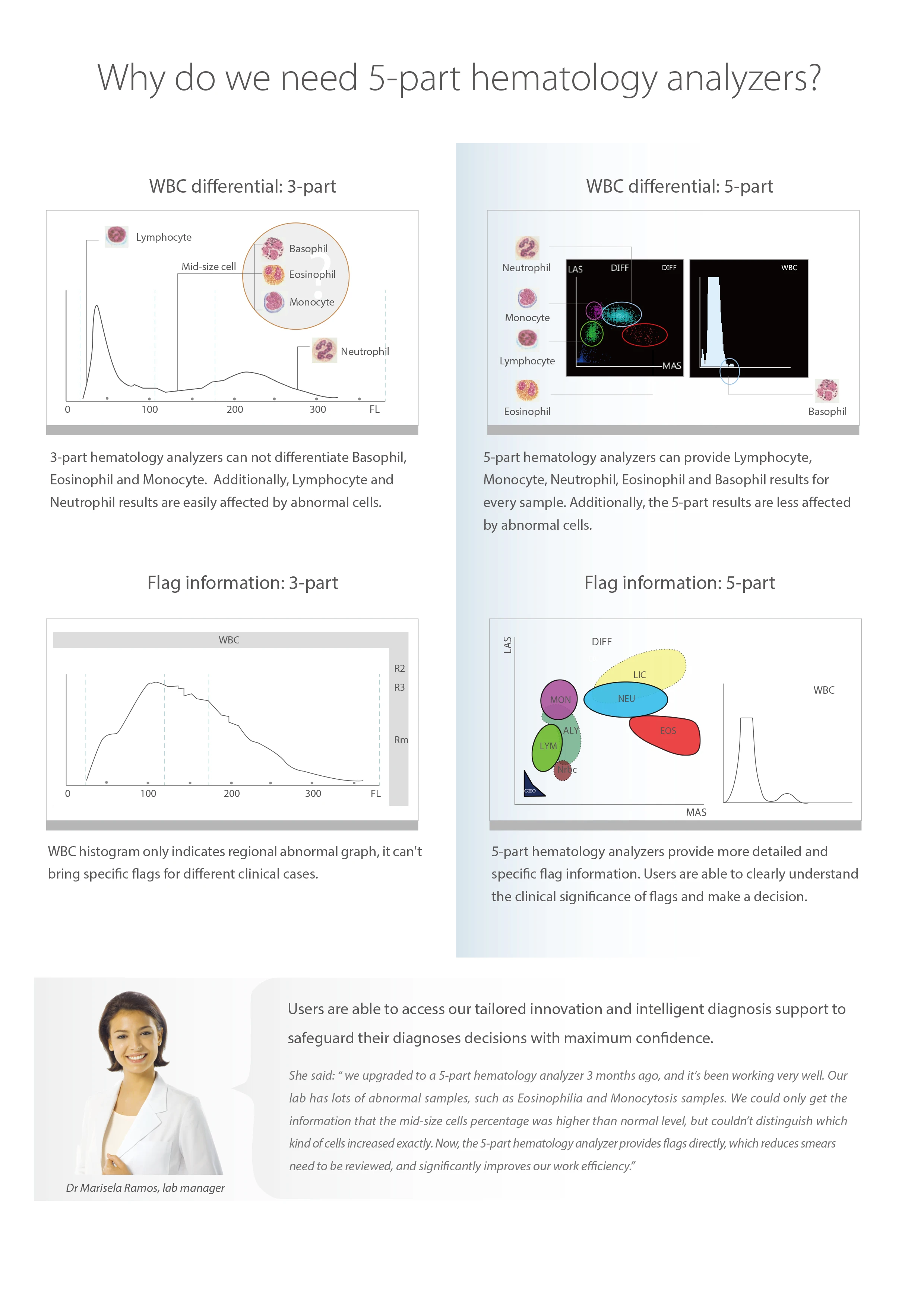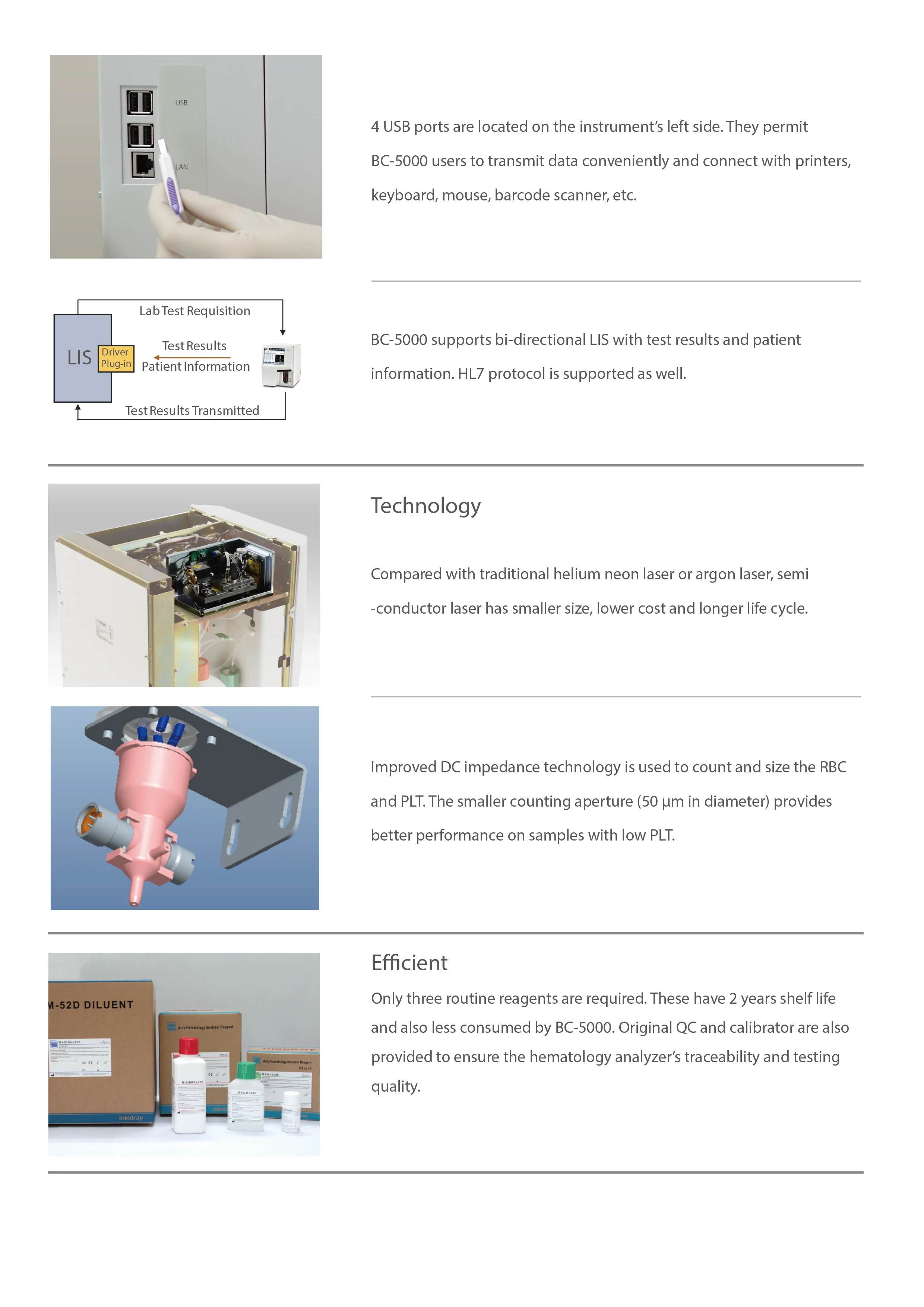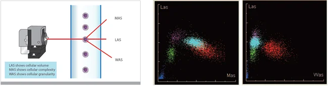 Principles | Impedance method for RBC and PLT counting Cyanide free reagent for hemoglobin test Flow Cytometry (FCM) + Tri-angle laser scatter + Chemical dye method for WBC 5-part analysis and WBC counting | ||||||