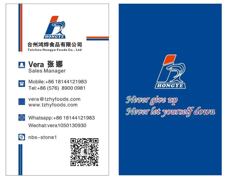 Taizhou Hongye Foods Co.,Ltd is engaged in export of Aquatic Products(Pacific Mackerel, Saury, Sardine,Horse Mackerel, Spanish Mackerel, Squid, Mahi Mahi, and fish loins and fillets, etc.), Tea Leaf, Vegetables and Fruits, our main market is Russia,EU,Southeast Asia, Middle East and Africa, etc.