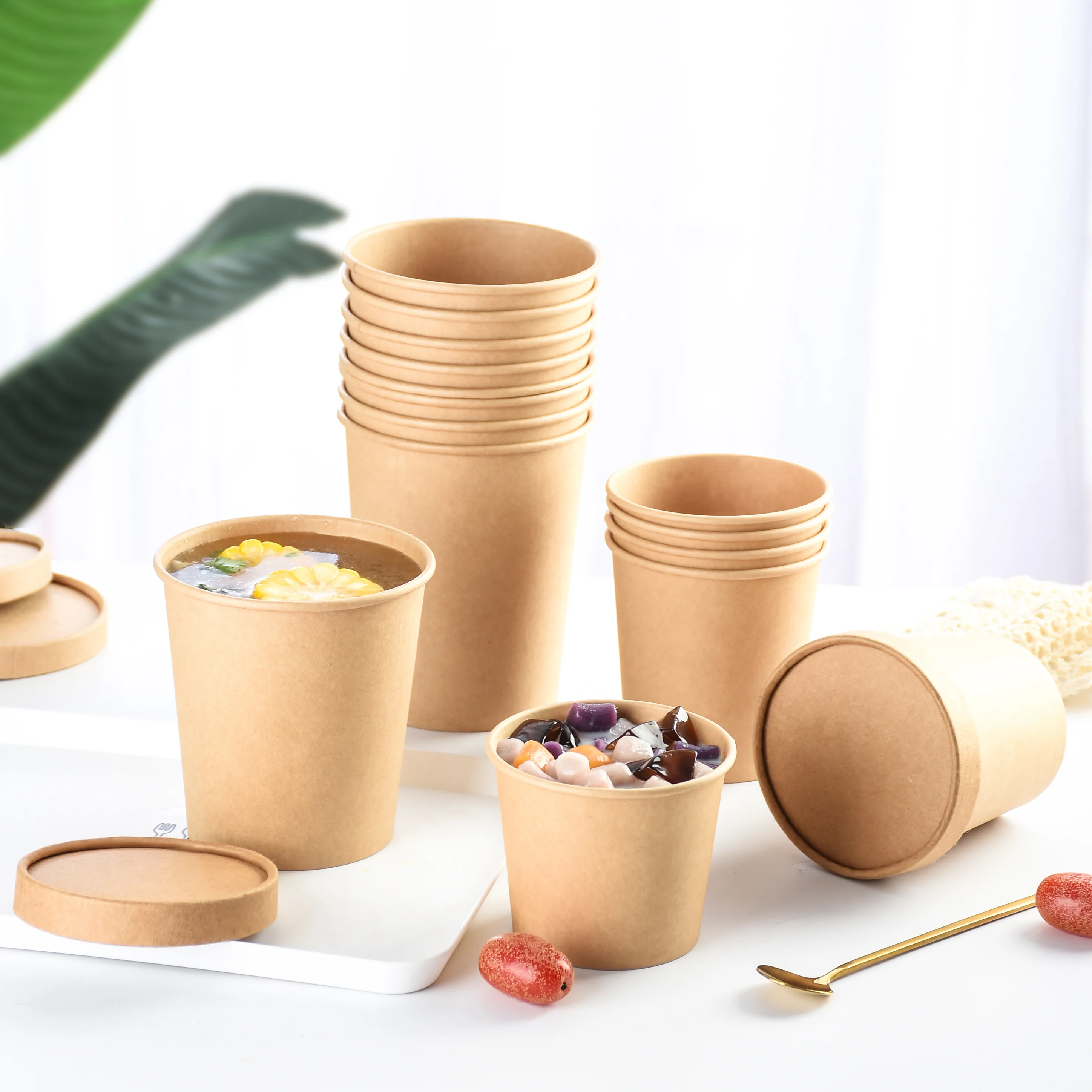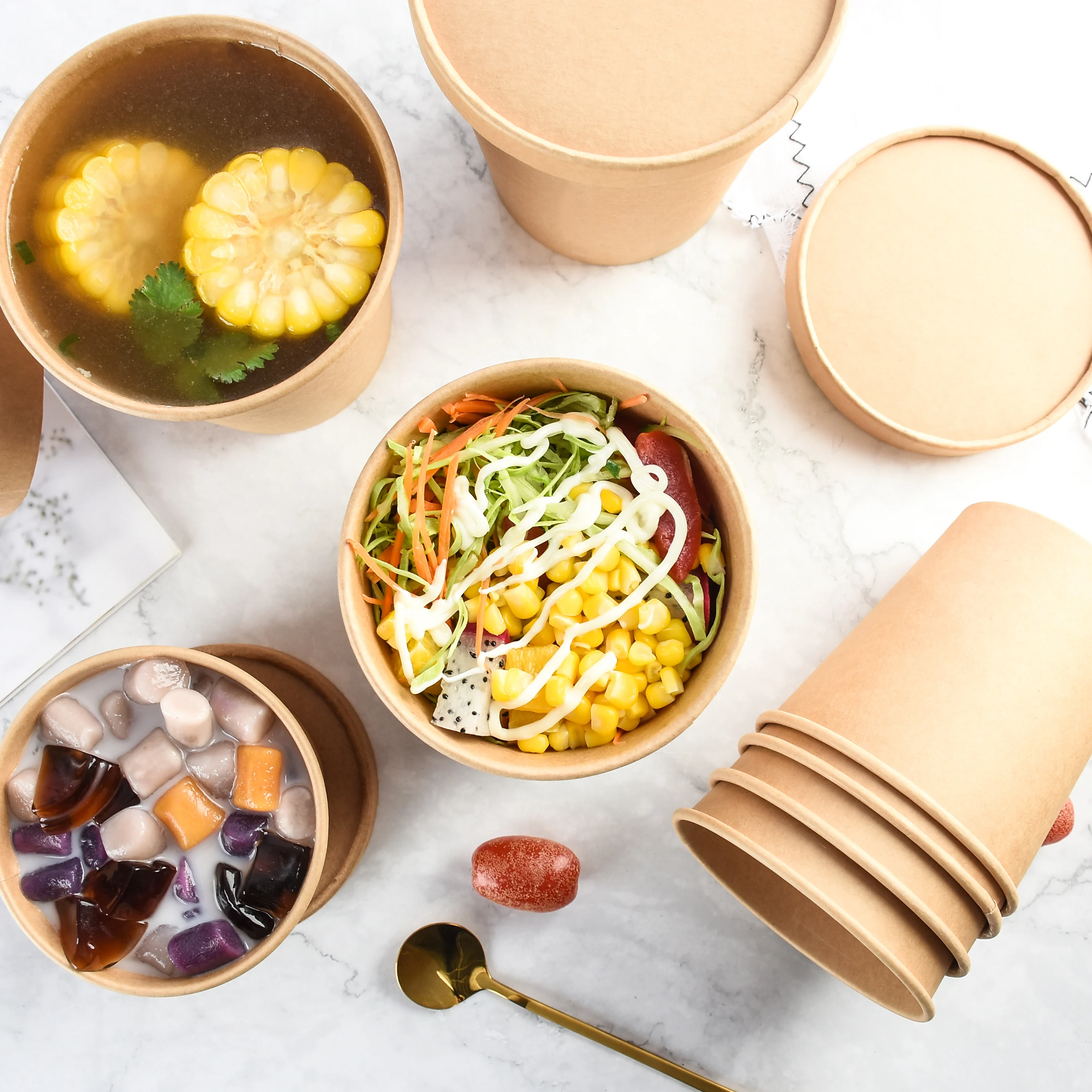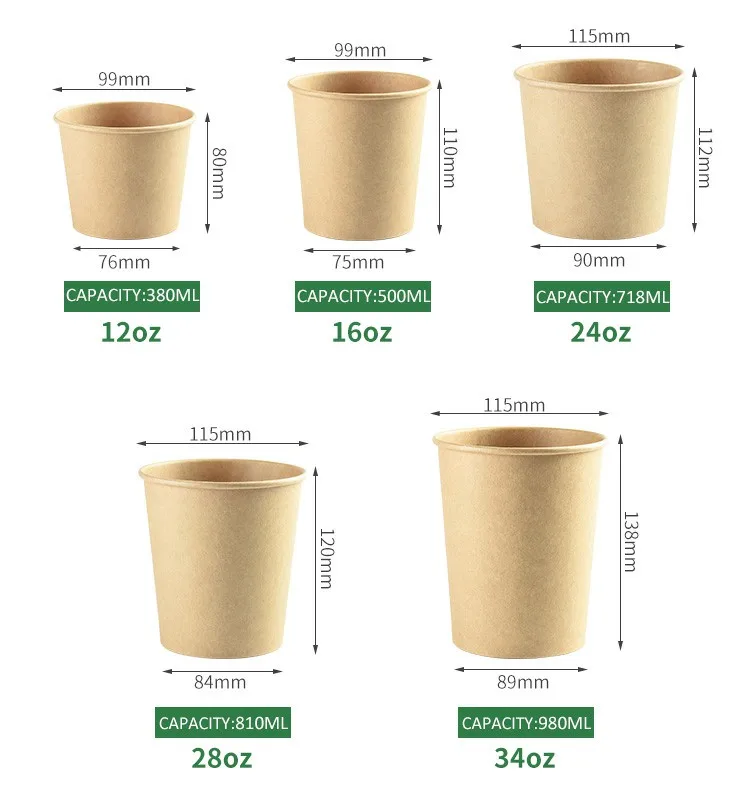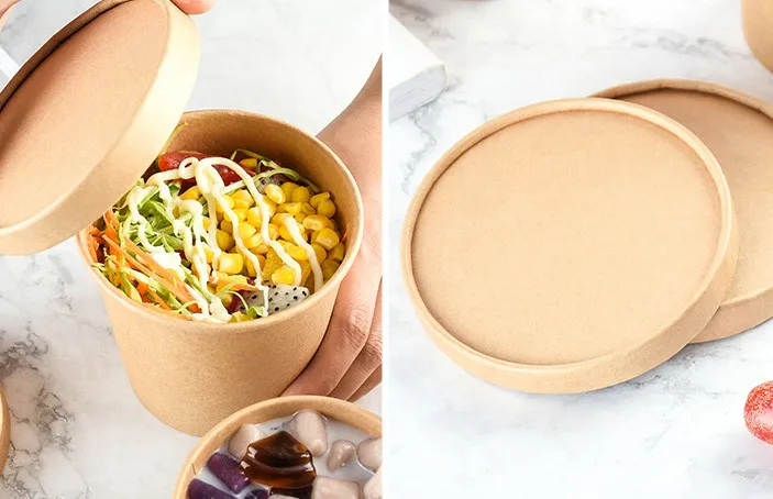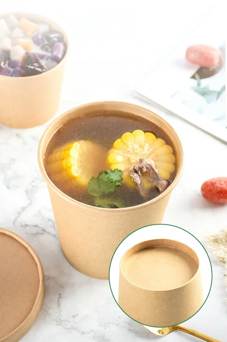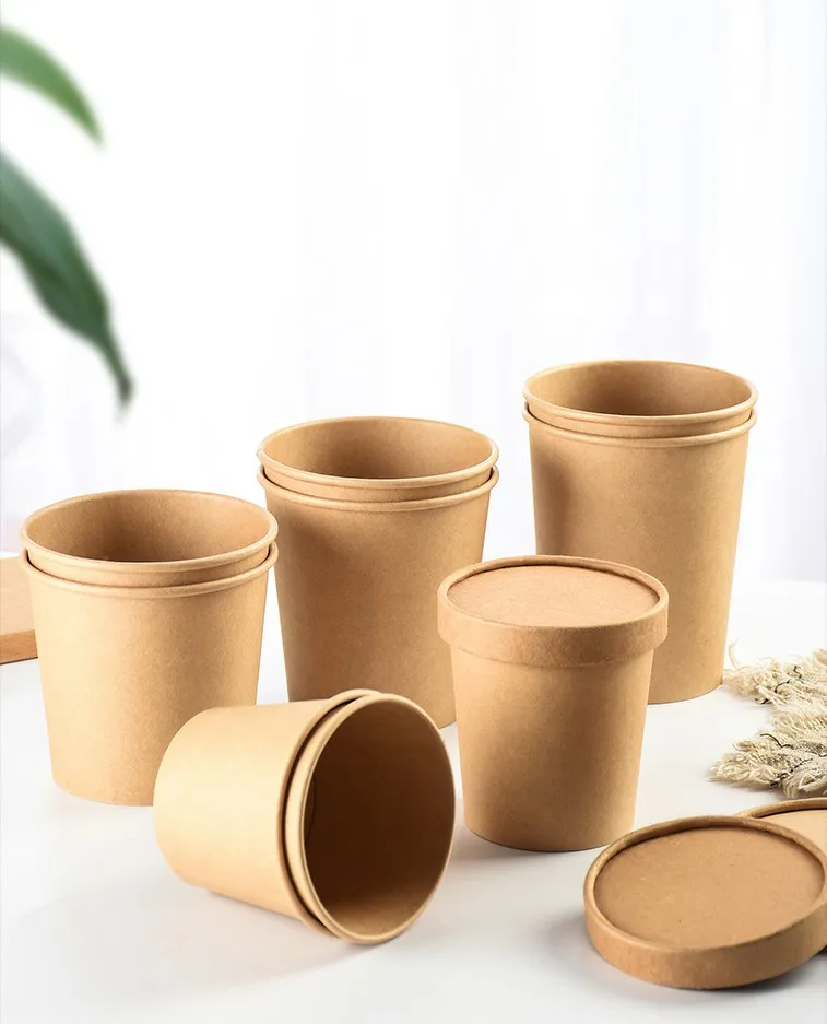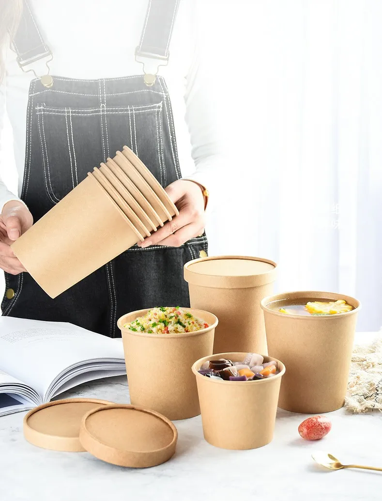 Cheap Price Disposable Food Grade Different Sizes Kraft Paper Bowl with Paper Lid for Soup Salad Instant Noodles