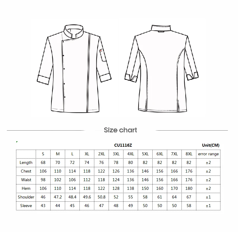 8. Working life is 2Times of The Ordinary Chef Uniform 9. No Pilling For Ever 10.Eco-friendly, Free of phenylenediamine carcinogens 11.Fabric certification: OEKO-TEX Standard 100. 12.Wash-resistant Chef Clothing:Products can be washed 200 times